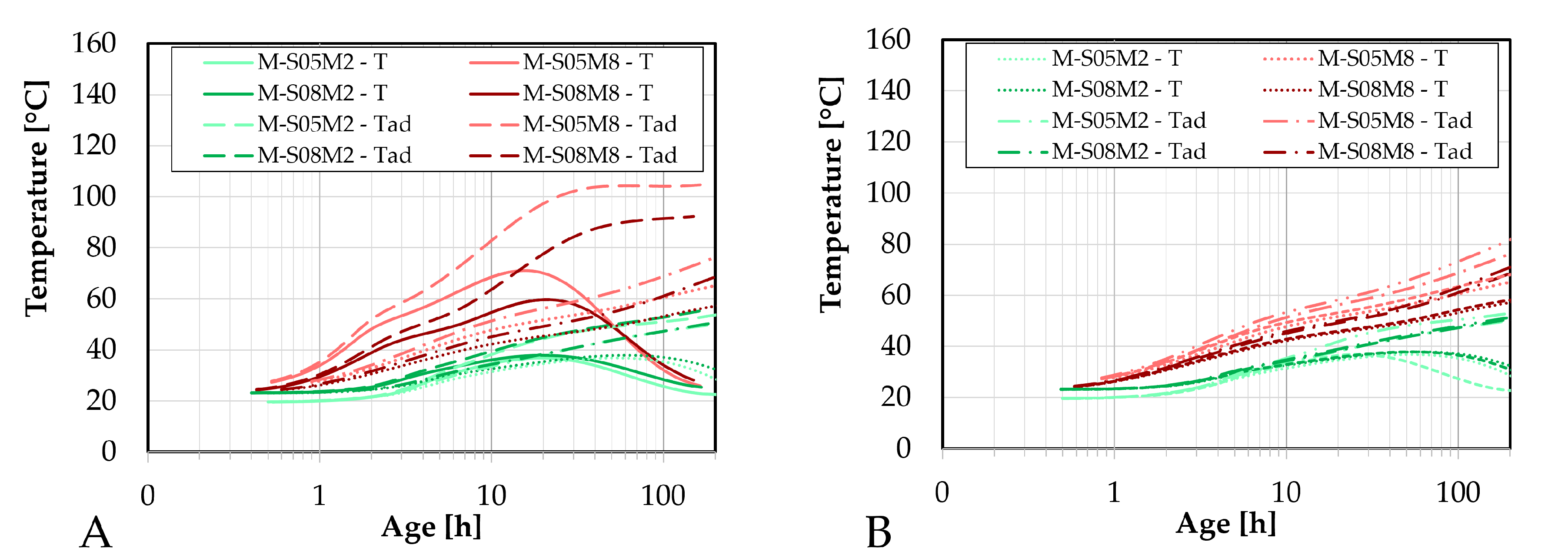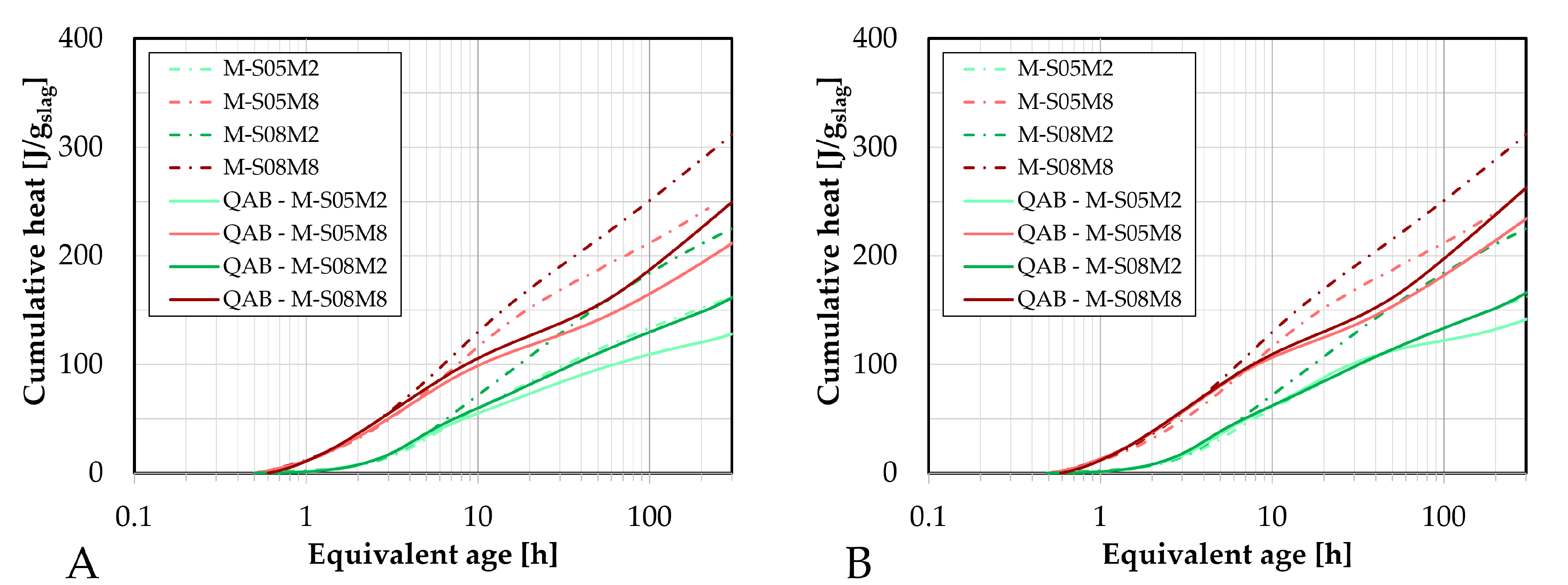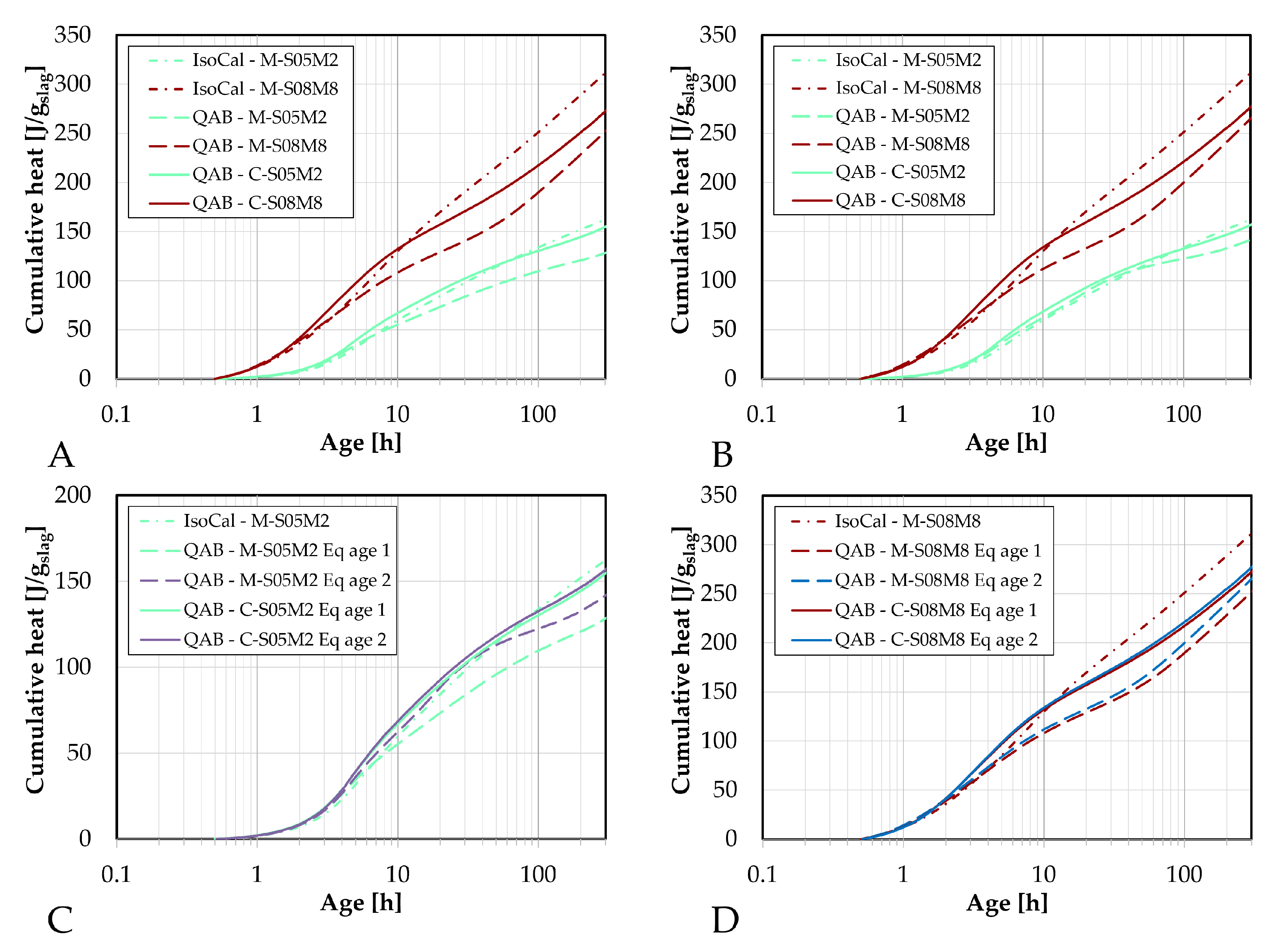 Autogenous strain of AAS mortars obtained with the BTJade device, presented as function of the equivalent age: (A). Compositions activated with S/B = 0.5 (compared to the equivalent corrugated tubes method), (B). Compositions activated with S/B = 0.8 (compared to the equivalent corrugated tubes method), (C). Comparison of all mortar compositions, (D). Comparison of the mortar compositions tested with BTJade. — = BTJade results, - · - : Corrugated tubes method.