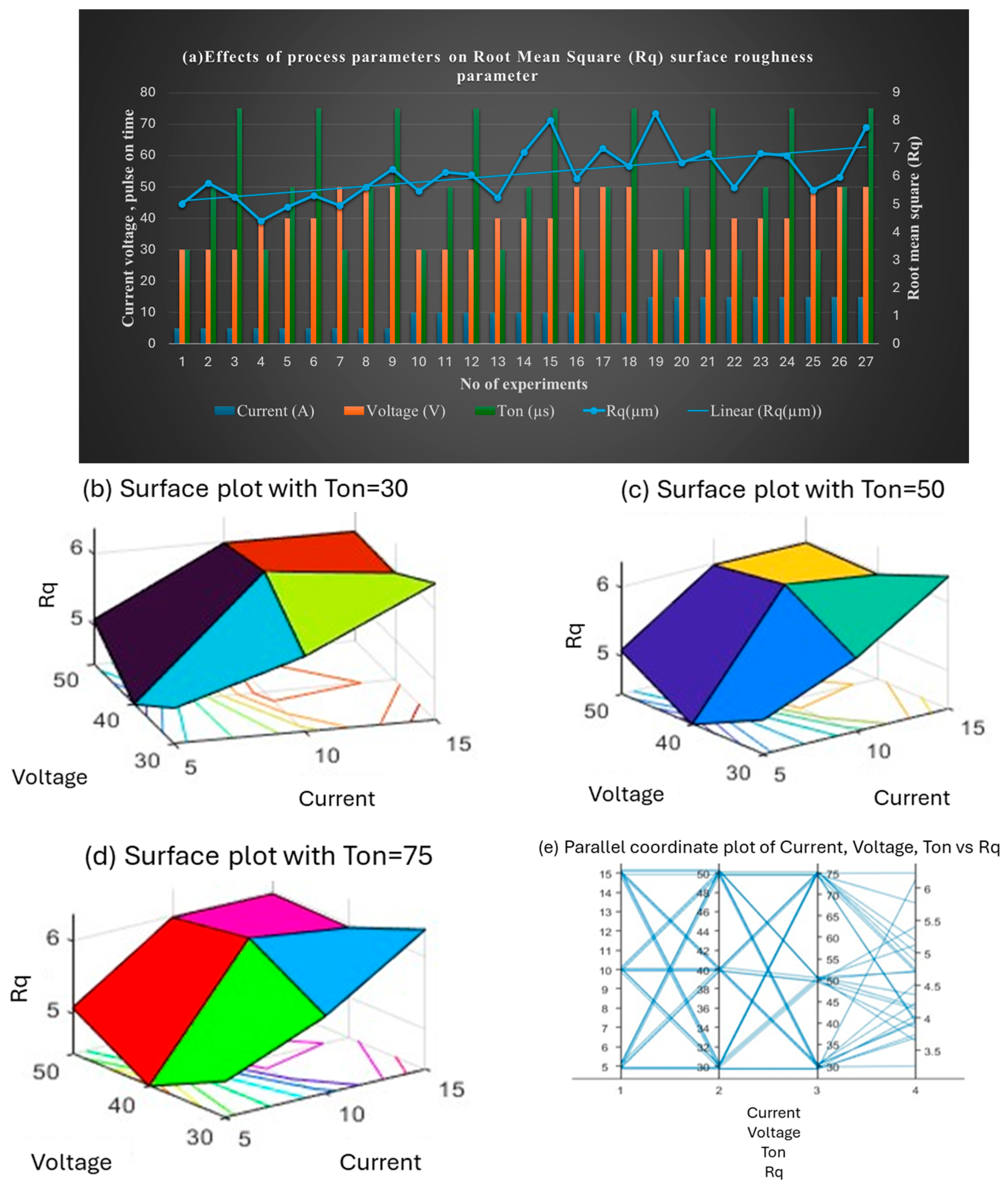 Rq | Current (A), Ton (µs) | 55.48% | 42.12% | 18.85% | Good model fit; current significantly affects Rq. |