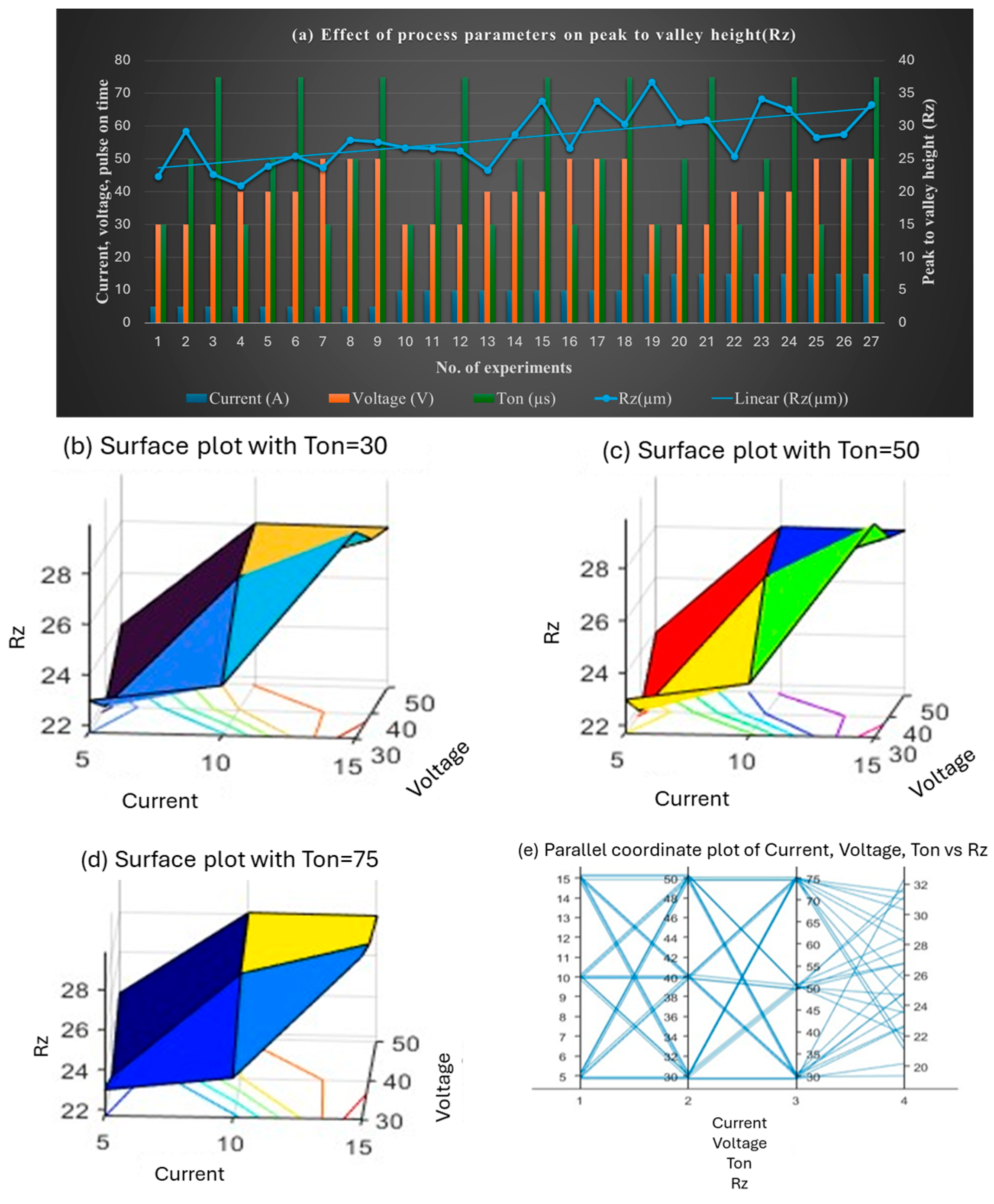 Ra | Current (A), Ton (µs) | 52.77% | 38.61% | 13.93% | Moderate model fit; current and Ton significantly affect Ra. |
