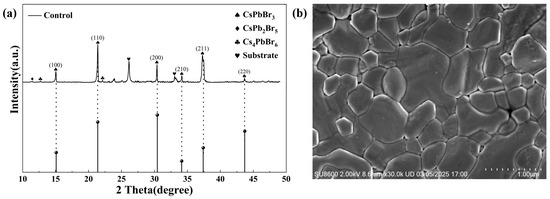 (a) XRD spectrum and (b) SEM image of the control CsPbBr3 film on FTO/TiO2 substrate.