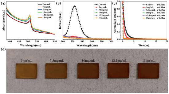 (a) UV-vis, (b) PL, (c) TRPL, and (d) photos of the FTO/TiO2/CsPbBr3/P3HT samples with various concentrations of P3HT solution.