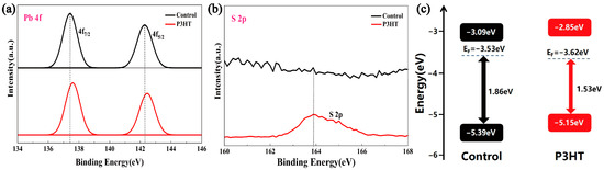 (a) Pb 4f, (b) S 2p XPS spectra, and (c) energy band structure calculated from the UPS spectra for the control and P3HT-modified samples (10 mg/mL). The XPS spectra of C 1s, Cs 3d, and Br 3d can be found in Figure S2.
