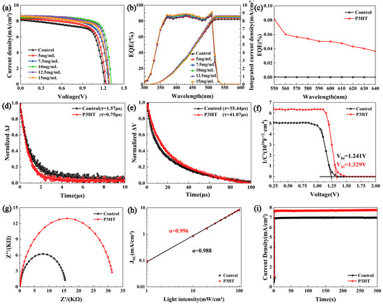 (a) J-V, (b) EQE and integrated current densities, (c) IPCE spectra of P3HT processing devices (550 nm–640 nm), (d) TPC, (e) TPV, (f) C-V, (g) EIS, (h) light intensity-dependent PCE curves of control and P3HT treatment films, and (i) steady-state current outputs.