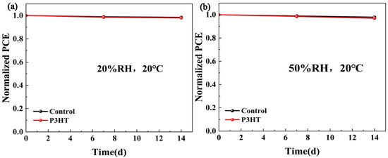The built-in electric field (Vbi) of cells was extracted from the C-V test results in Figure 4f, and remarkably the Vbi value of devices increased from 1.241 V to 1.329 V after the P3HT modification. The higher built-in voltage facilitates carrier transport and forms a wider depletion region, thereby suppressing the carrier recombination [28,29]. Additionally, the enhanced Vbi explains the higher VOC in the corresponding CsPbBr3/P3HT cells. The EIS test results are shown in Figure 4g. A larger arc radius indicates a higher recombination resistance (Rrec), suggesting that the non-radiative recombination was suppressed in the P3HT-modified PSCs. Figure 4h displays the light intensity-dependent JSC for the solar cell. The α value closer to one suggests a lower bimolecular recombination in the PSCs. The α value increased from 0.988 in the original devices to 0.996 in the P3HT-treated CsPbBr3 PSCs, indicating suppressed bimolecular recombination and enhanced charge carrier separation. The steady output curves at the maximum power point in Figure 4i and both the control and P3HT-modified devices showed the stable photocurrent output ability, and the optimized device obtained an increased steady current density from 6.8 mA/cm2 to 7.6 mA/cm2, which demonstrated the excellent stability of PSCs under the continuous illumination. In addition, we conducted a comparative stability study of the PSCs with and without the P3HT modification under various environmental conditions. As shown in Figure 5a, when the unencapsulated devices were stored in a drying cabinet (20%RH, 20 °C) for two weeks, all the devices maintained approximately 98% of their original PCEs. Figure 5b shows the normalized PCE decay curves of the samples placed in a laboratory environment (50%RH, 20 °C). The results demonstrated that both the control and P3HT-modified devices retained about 97% of their initial efficiency. The results indicate that the stability of the devices modified with P3HT was not compromised.