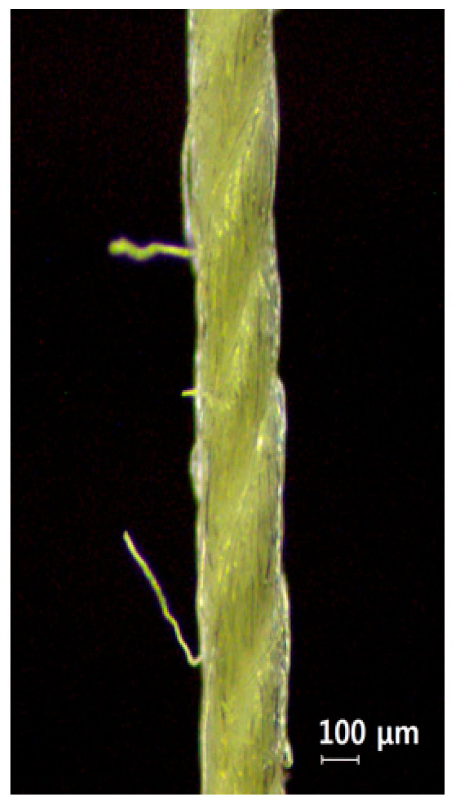 3.1.2. Effect of Silane Surface Treatment on Yarn Diameter and Twist Angle of Cotton Yarns