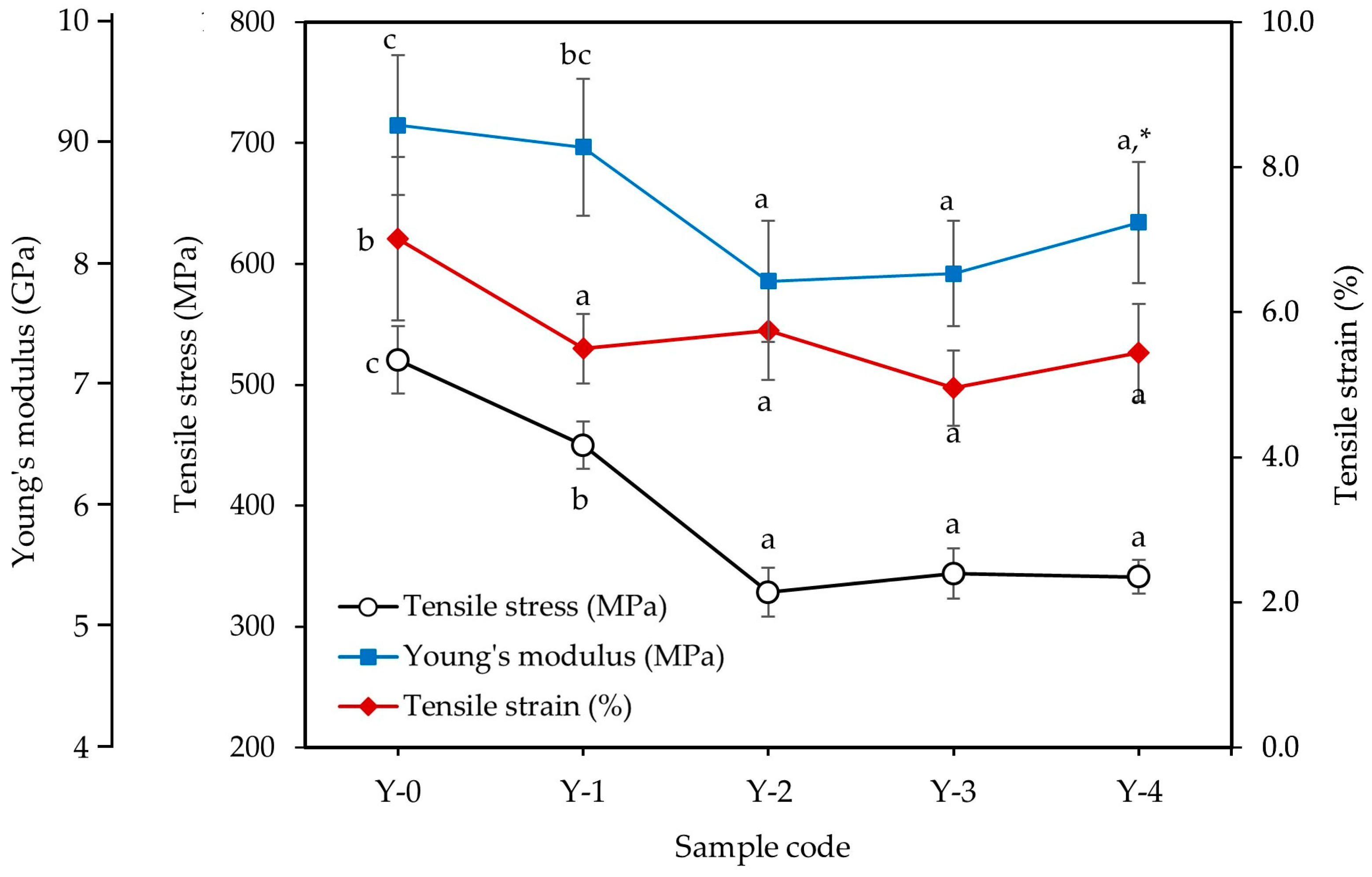 Cotton yarn/PLA biocomposites | 0% | 92.96 | 1064.59 | 496.01 ± 140.46 | 47.22 | 20.74 ± 3.81 |