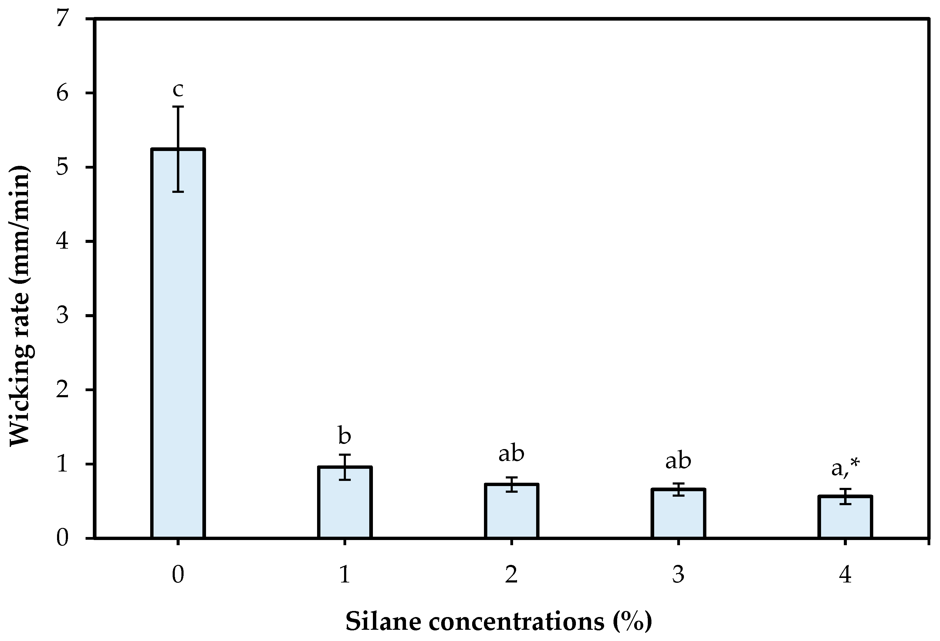 3.1.4. Effect of Silane Surface Treatment on the Liquid Wicking Rate of Cotton Yarns