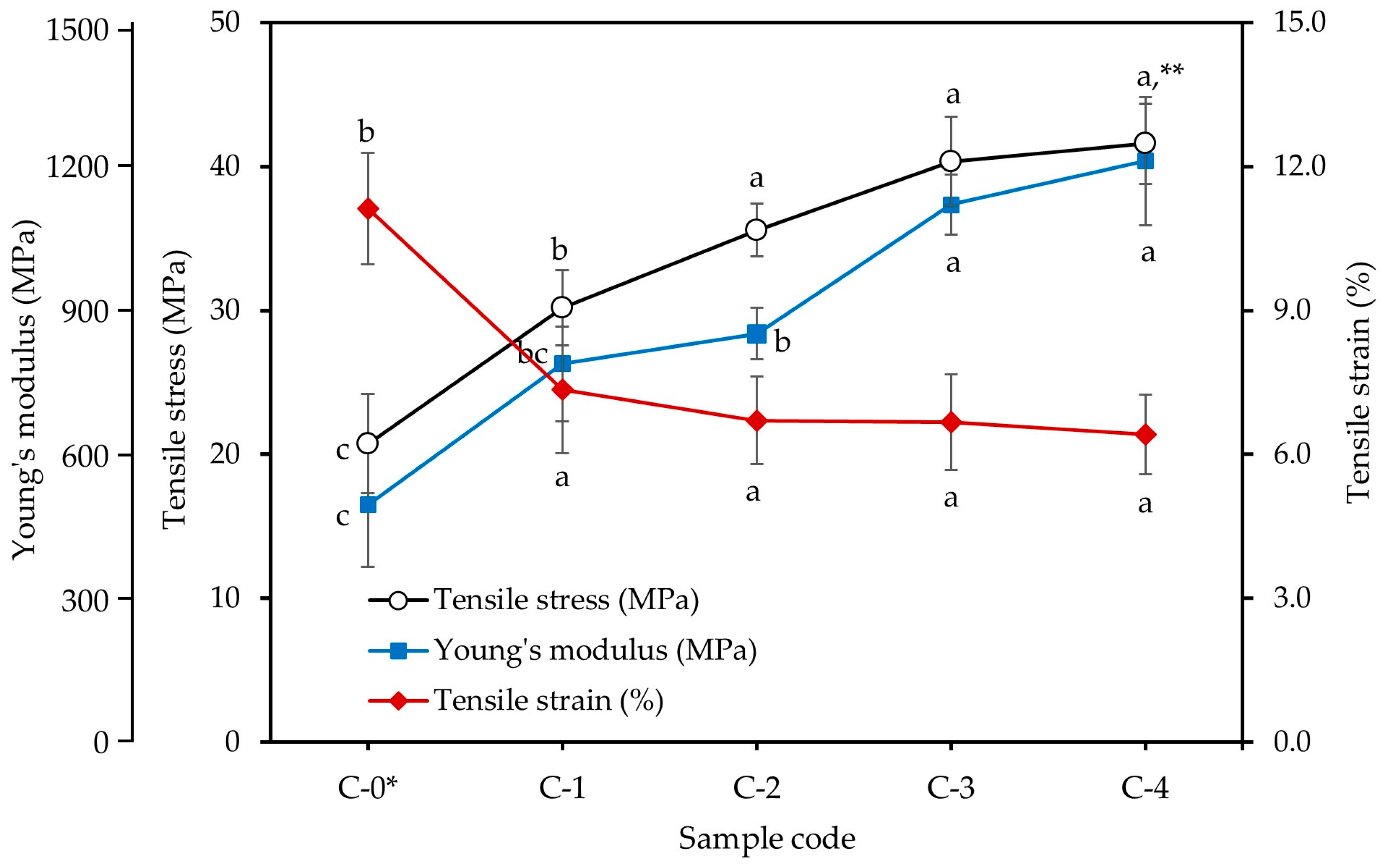 2.5.2. Tensile Properties of Cotton Yarn/PLA Biocomposites