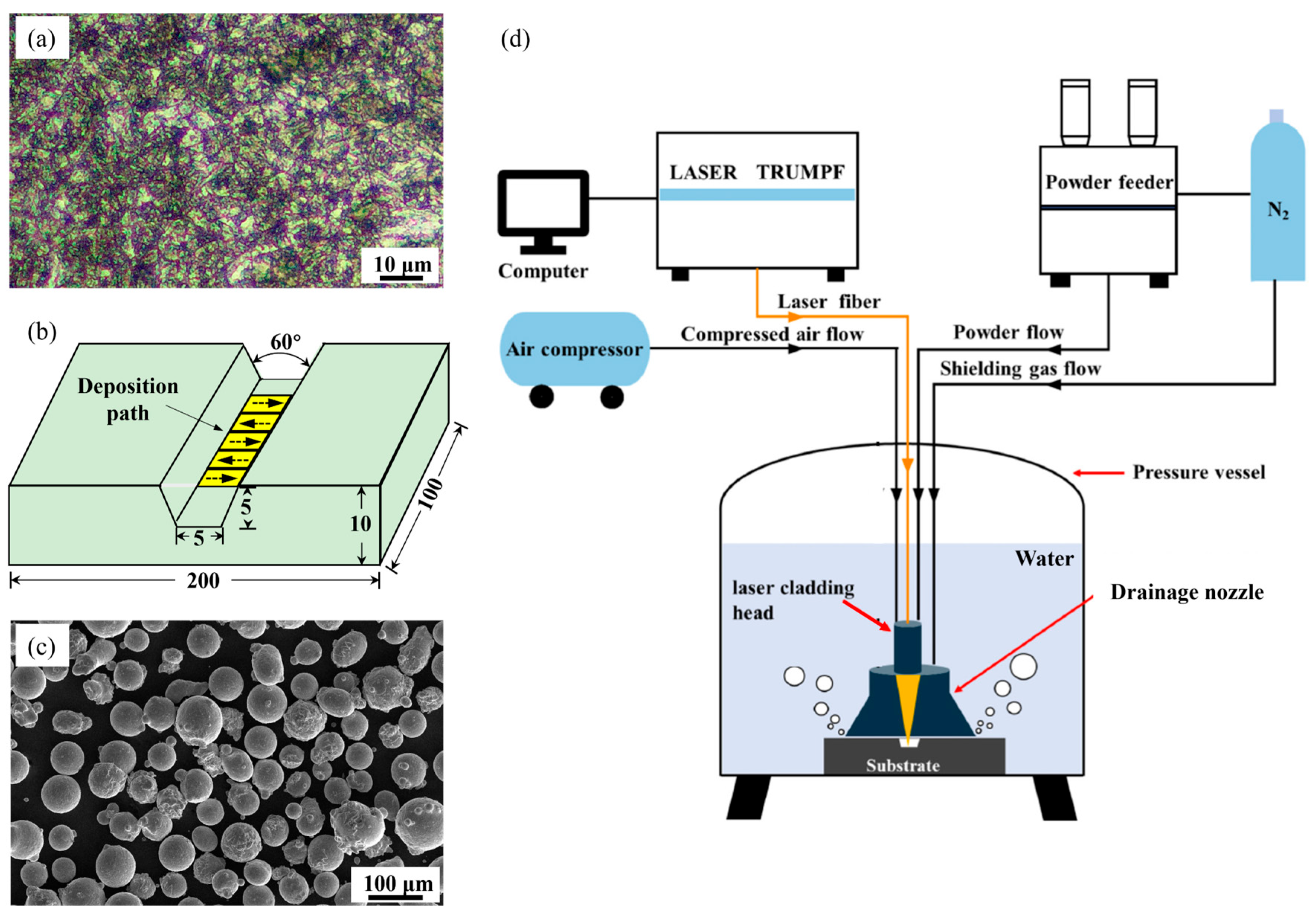 - Li, C.; Wang, C.; Deng, C.; Cui, L.; Zhang, X.; Zhao, C.; Jiao, X. Microstructure and properties of underwater in-situ wire-based laser additive manufactured duplex stainless steel. Virtual Phys. Prototyp. 2024, 19, e2401925. [Google Scholar] [CrossRef]