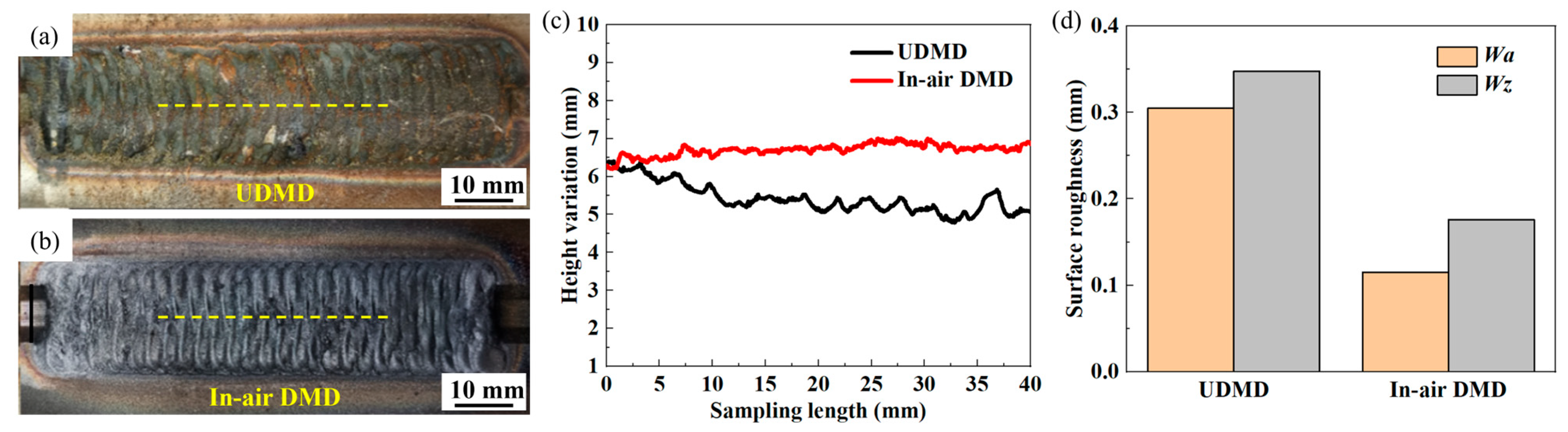 - Microstructural analysis revealed that the UDMD process, under rapid water cooling and gas shielding, produces finer cellular structures and denser lath martensite with higher dislocation density compared to in-air DMD. This refined microstructure is attributed to accelerated solidification rates, which enhance the microhardness and contribute to improved surface integrity.