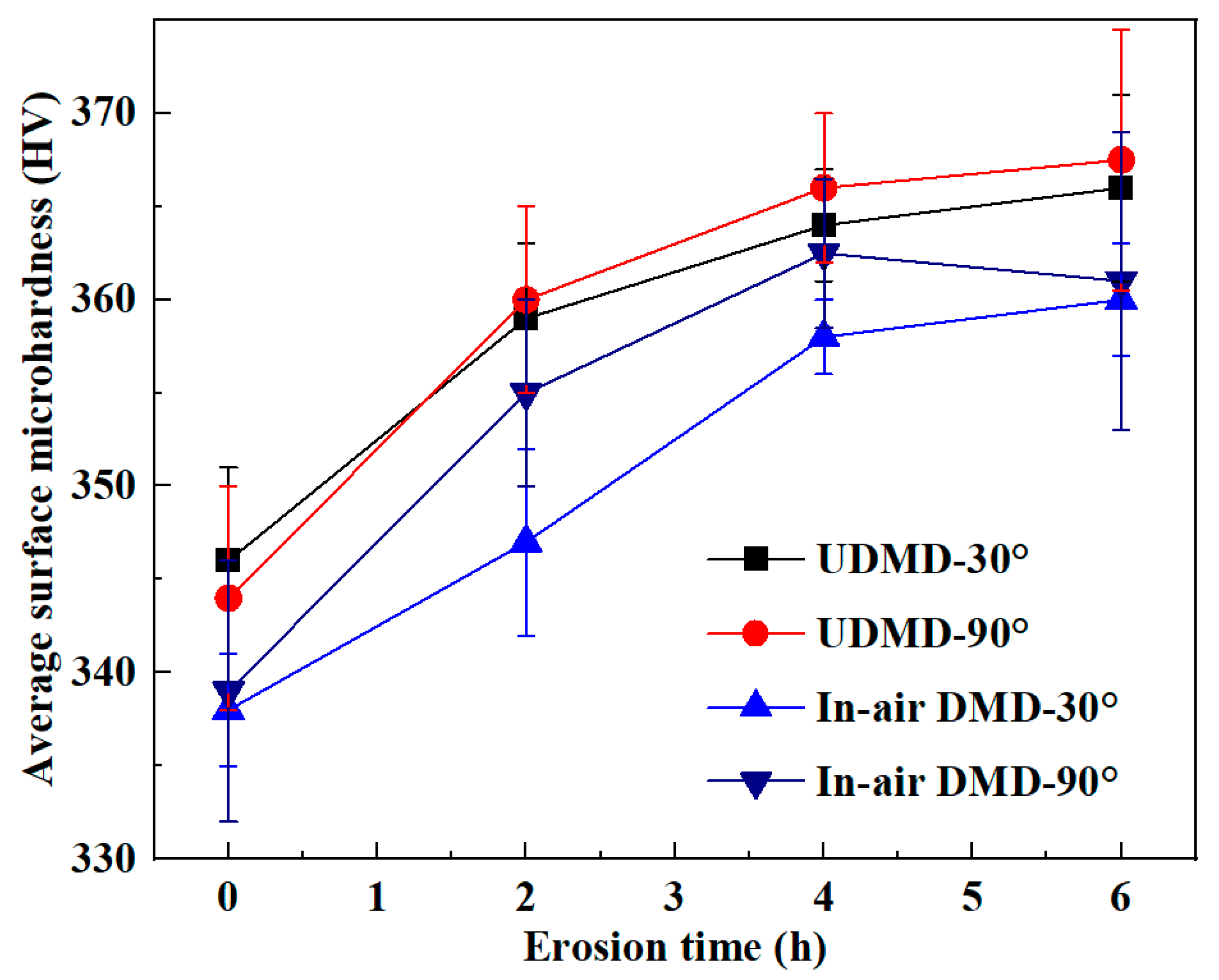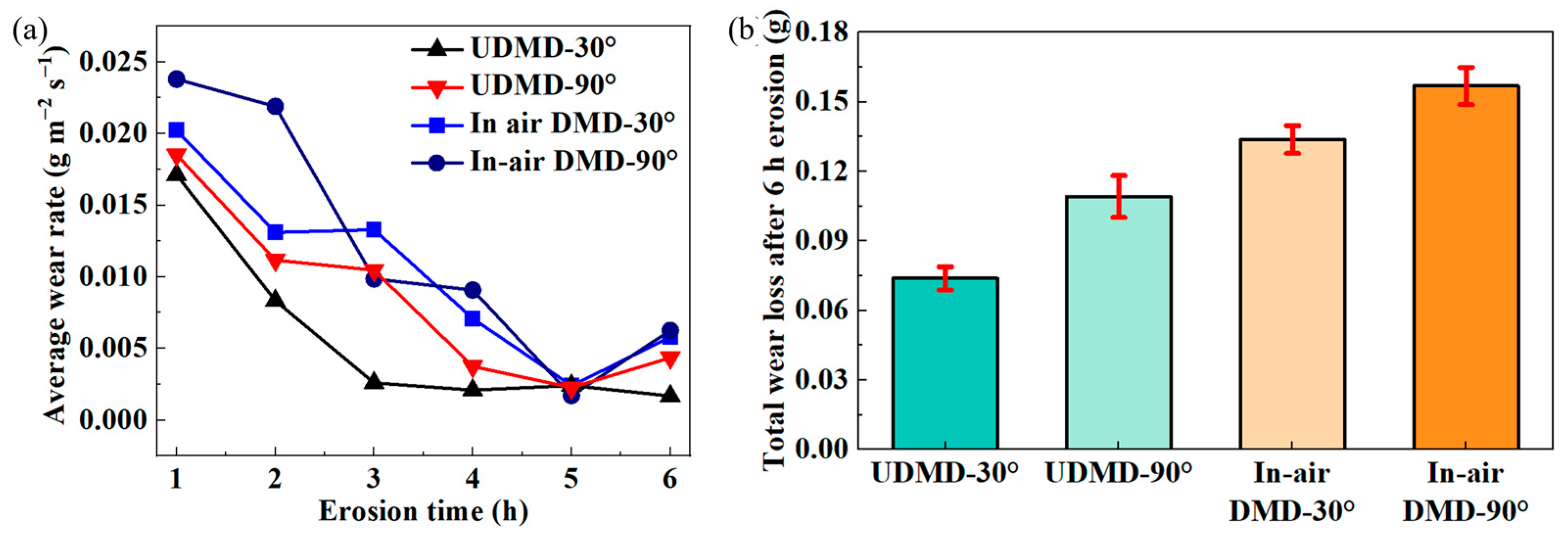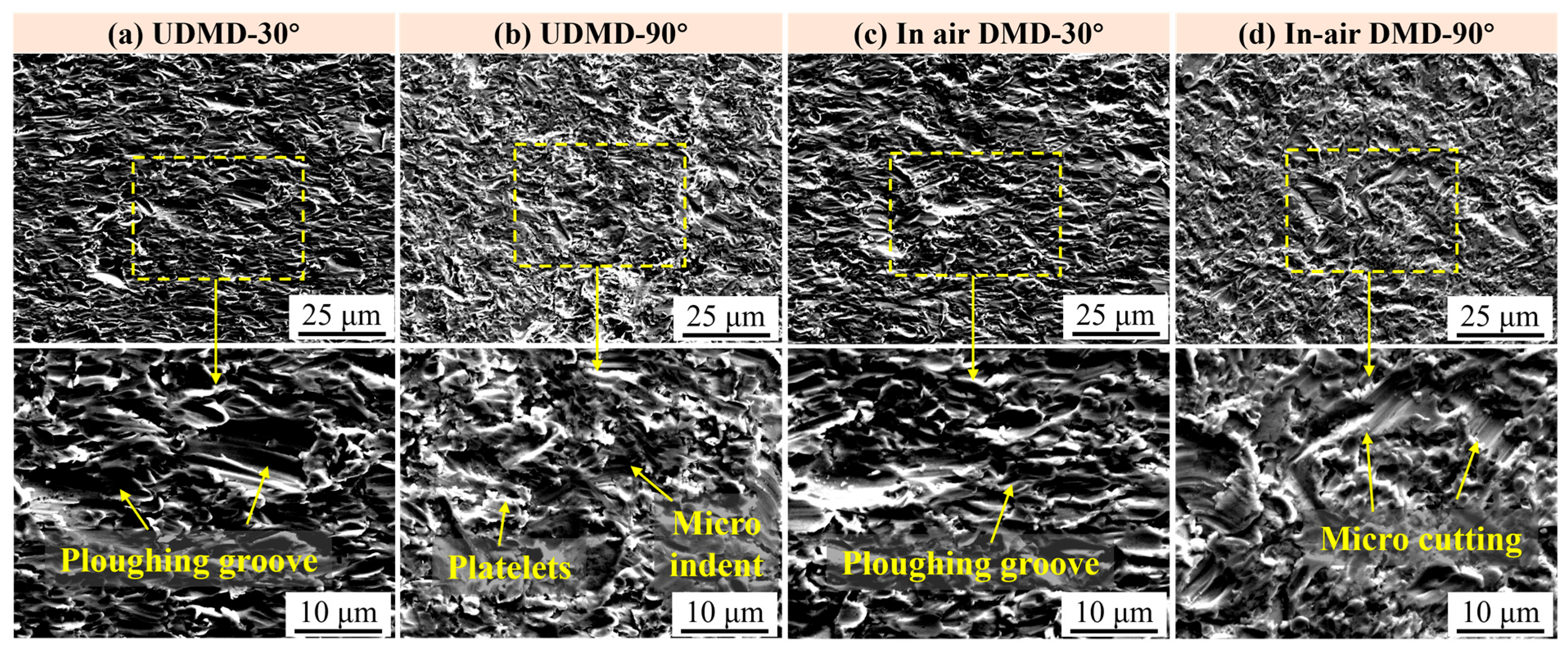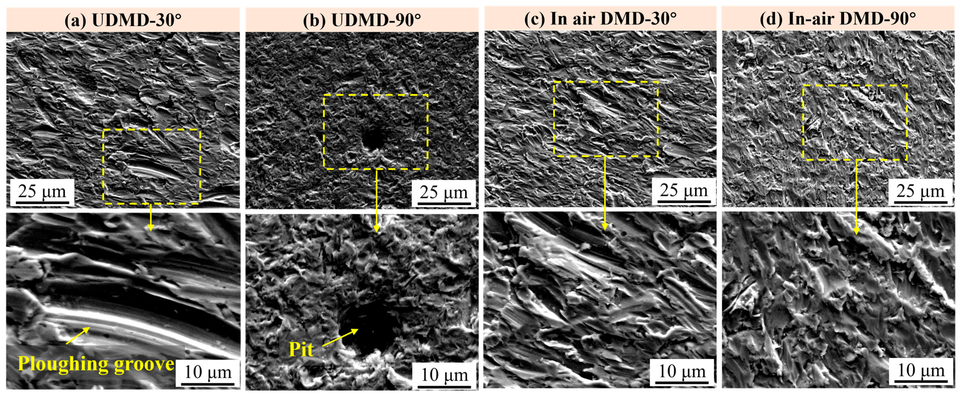 - Erosion wear tests at 30° and 90° impingement angles reveal distinct wear mechanisms: oblique impacts cause cutting and plowing, while normal impacts induce indentation, cracking, and spallation. The UDMD samples exhibit lower volumetric wear rates and total mass loss, particularly at 30°, indicating superior erosion resistance due to their finer microstructure and higher hardness.