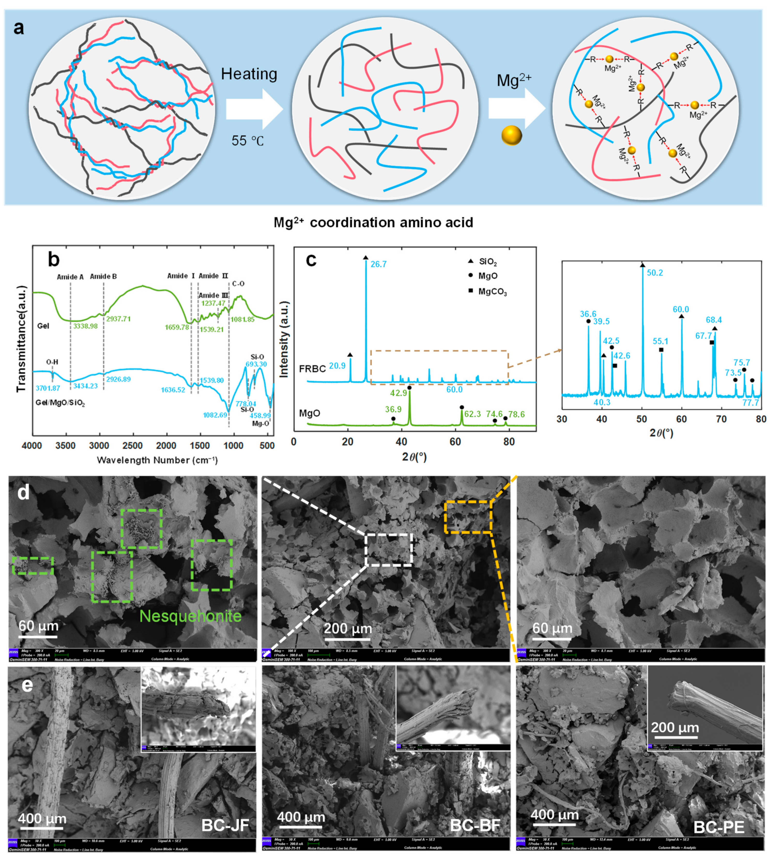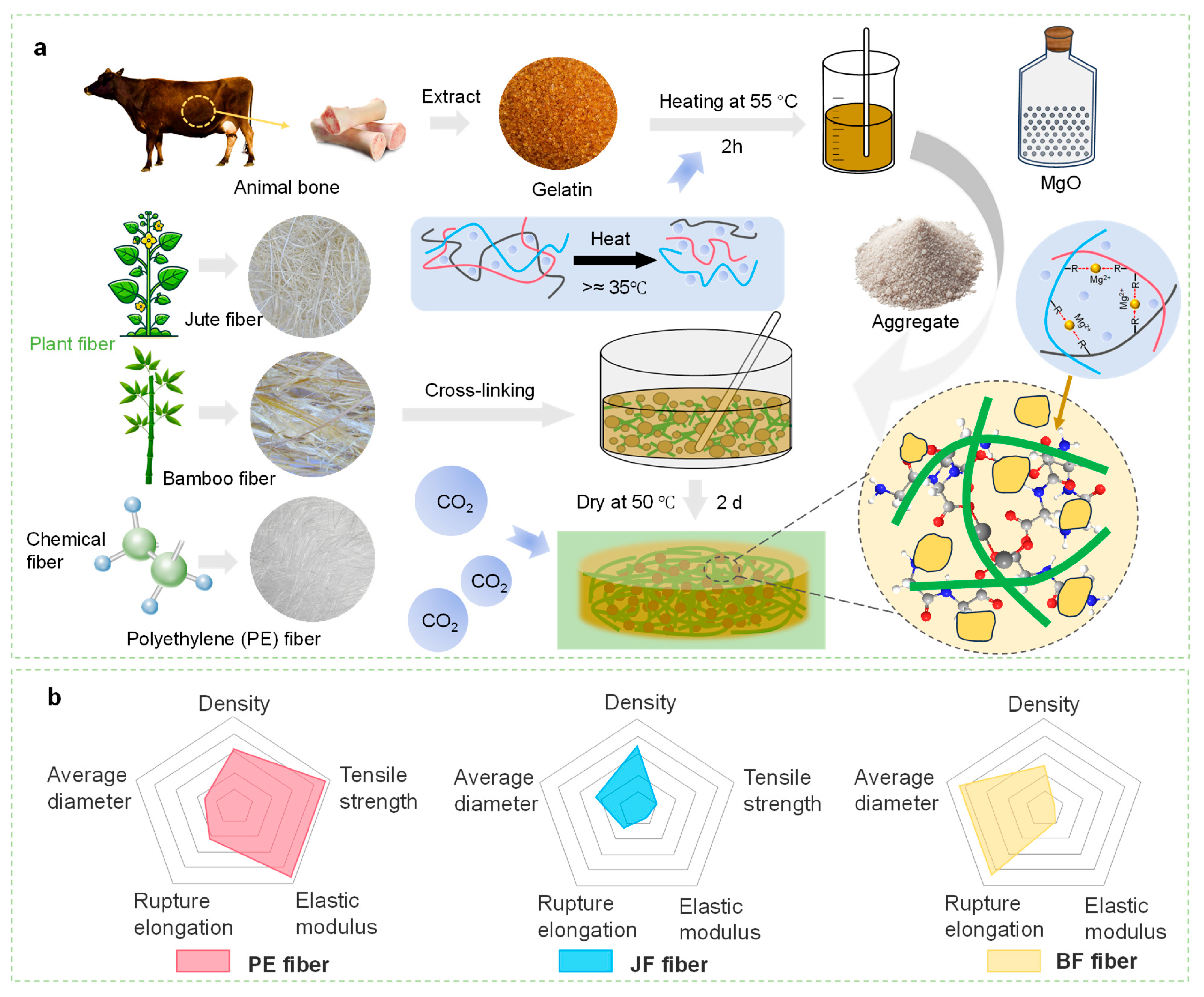 - Microstructural analysis showed that gelatin formed a stable triple-helix structure upon heating and coordination with Mg2+, enhancing matrix compactness and integrity. FTIR and XRD confirmed gelatin–Mg2+ coordination and the synergistic effect of quartz sand, which together improved thermal stability and strength. A porous honeycomb structure facilitated stress distribution and energy dissipation, while the fiber pull-out mechanism of PE under impact provided strong interfacial bonding and toughening effects.