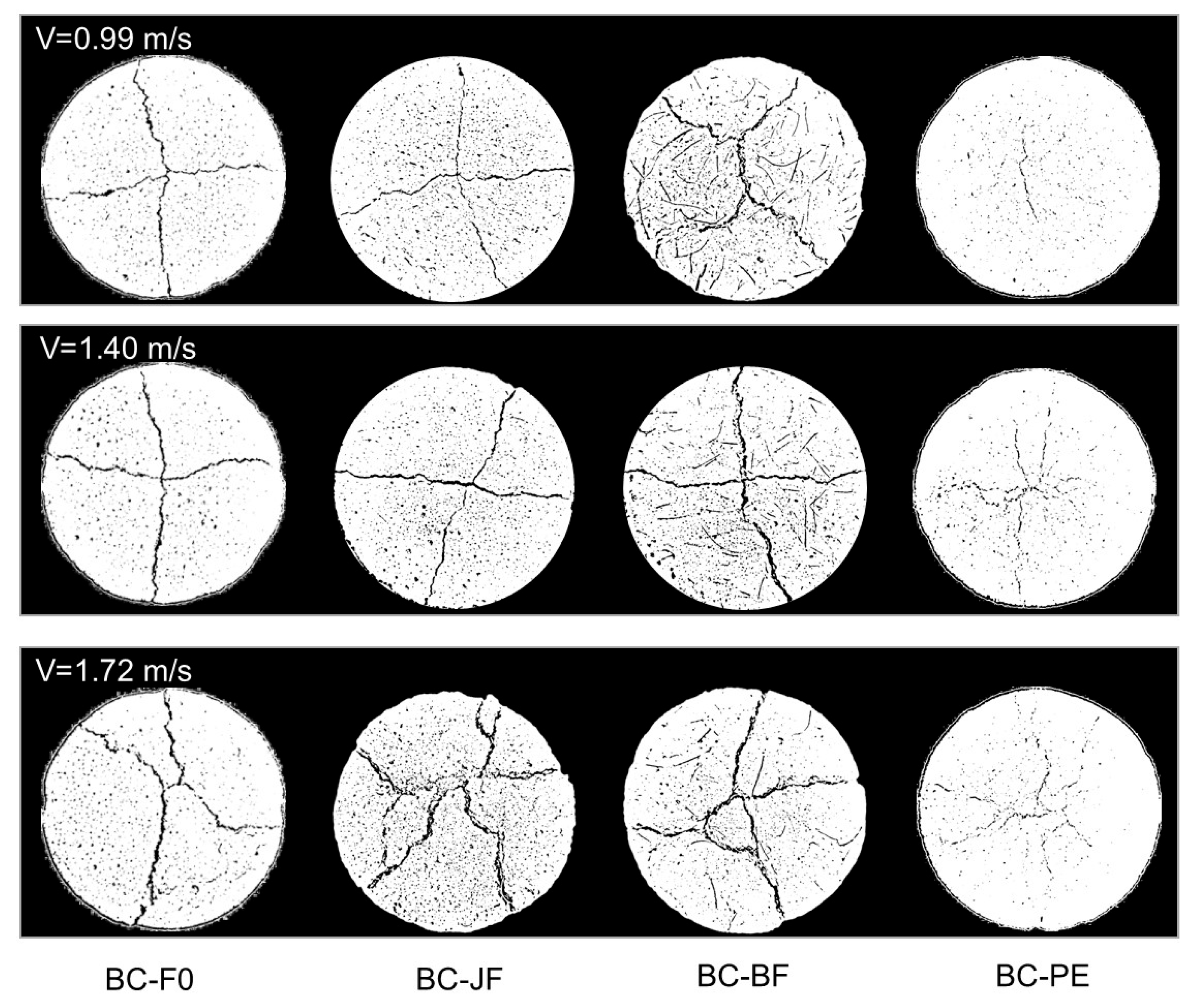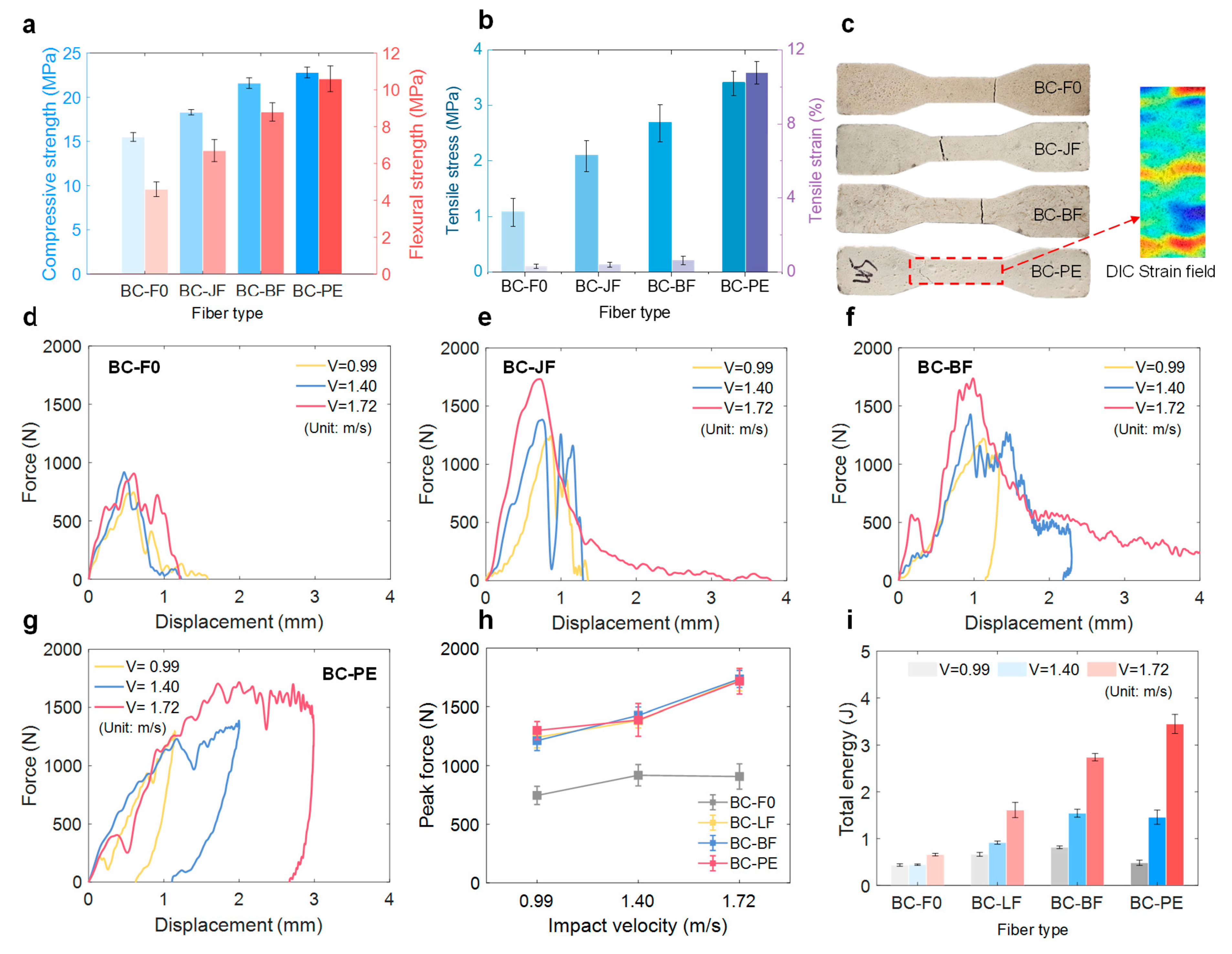 - Fiber incorporation markedly enhanced BFRC performance. Bamboo fiber (BC-BF) improved compressive and flexural strength, whereas PE fiber (BC-PE) showed the best overall results, with compressive, flexural, and tensile strengths of 22.8, 10.6, and 3.40 MPa, respectively, and a tensile strain of 10.77%. The superior crack-bridging ability of PE fibers promoted multiple microcracks, improving toughness and load capacity. Impact tests confirmed that BC-PE exhibited the highest peak impact force and energy absorption, outperforming all other fiber types.