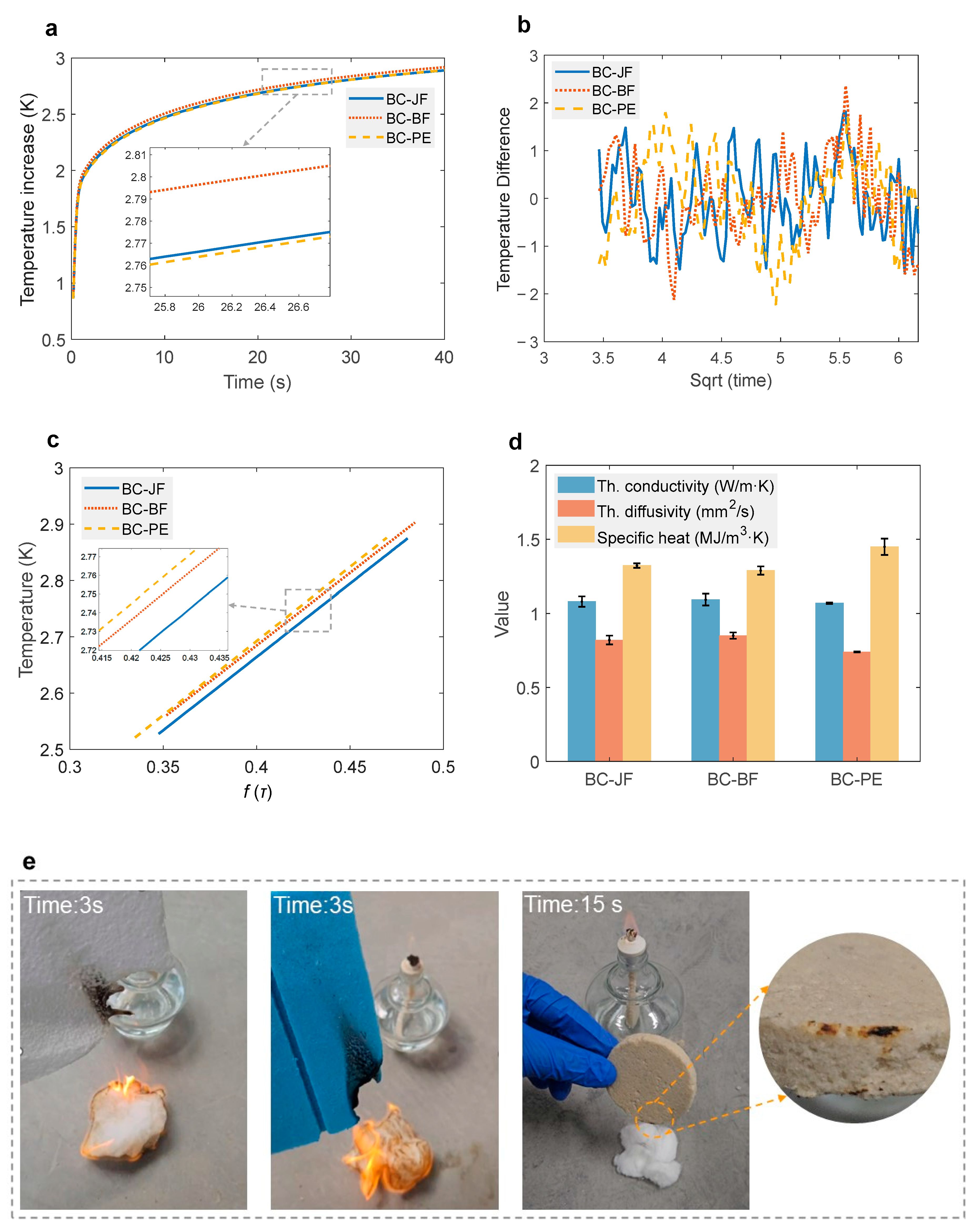 - Thermal conductivities of fiber-reinforced composites were comparable, but thermal diffusivity and specific heat capacity differed. BC-BF showed higher thermal conductivity, while BC-PE demonstrated superior heat storage and buffering capacity. Flame exposure tests further confirmed the excellent flame-retardant behavior of BFRCs, indicating favorable thermal safety.