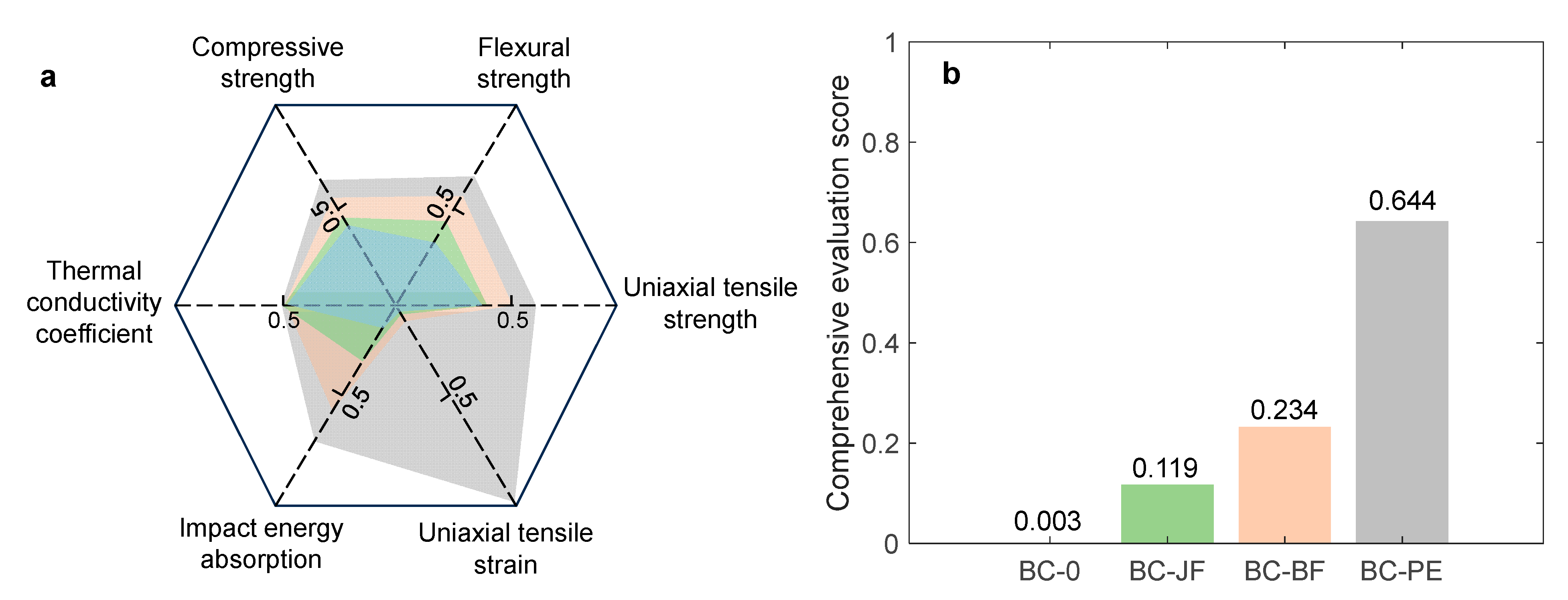 - Multi-criteria evaluation using the TOPSIS model identified BC-PE as the best-performing composite, with optimal tensile properties, impact resistance, and thermal regulation. This work provides insights and theoretical support for advancing bio-based composites in impact-resistant and functional insulation applications.