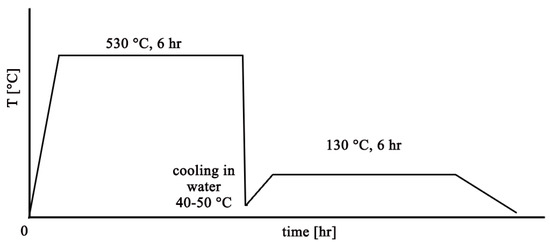The temperature regimes used for purposes of this experiment are based on the EN 1706:2020 standard [24], in which suitable heat treatment temperatures are given for the above-mentioned alloys, with which AlSi7CrMnCu2.5 is compared. Based on the available literature sources, the most frequently used artificial aging temperature for the aforementioned similar alloys is 130 ÷ 150 °C [25,26]. The diagram of the complete regime of the selected heat treatment is shown in Figure 1.