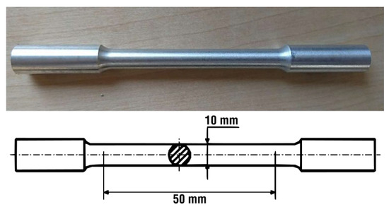 The static tensile test is one of the basic tests for determining the mechanical properties of metals. To determine the mechanical properties of the AlSi7CrMnCu2.5 alloy, a HEGEWALD & PESCHKE INSPECT 250 universal blasting machine (manufactured by the HEGEWALD & PESHKE company, Nossen, Germany) with a strain gauge was used for the experiment. The samples (see Figure 2) for the tensile test were machined into the shape of standardized test specimen rods with a circular cross-section of 10 mm in diameter and a test section length of 50 mm, determined according to ČSN EN ISO 6892-1 [27].