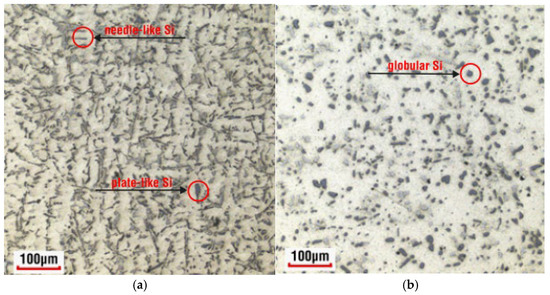 Figure 6 presents a comparison of the microstructure of the AlSi7CrMnCu2.5 alloy in the as-cast state (Figure 6a) and after heat treatment (Figure 6b). As can be seen from the image, the needles and plates of eutectic silicon (dark gray formations in image (Figure 6a)) were transformed into smaller globular formations (Figure 6b) due to heat treatment. Also, other (Cu-Si, Cr-Mn, or polycomponent) intermetallic phases changed their shape by the heat treatment process.