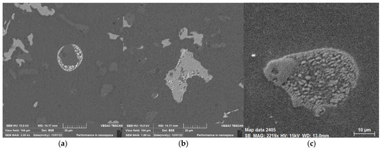 Elemental mapping (see Figure 8) of identified intermetallic phases (see Figure 7) has been conducted via EDX analysis using a TESCAN VEGA 3 electron microscope (manufactured by TESCAN GROUP, a.s., Brno, Czech Republic) with an EDX BRUKER analyser (manufactured by BRUKER Corp., Billerica, MA, USA).
