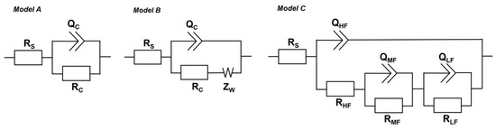 Equivalent electrical circuit diagrams for EIS fitting for: EP/30Zn and EP/10Zn/0.5CN/I coatings—model A (in the initial stage) and model B (at a later stage); EP/10Zn/0.5CN/II—model C.