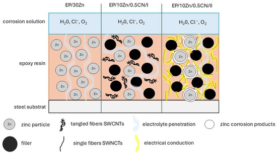 In this formulation, the zinc content was reduced from 30% to 10%, and replaced with 19.5% filler (barium sulfate) and 0.5% SWCNTs. The coating functions primarily as a barrier—nanotubes did not activate the zinc. The filler and the entangled SWCNTs act as obstacles to electrolyte penetration, forming a tortuous path that enhances barrier properties (maze mechanism).
