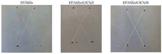 Based on the above images, red corrosion appeared in spots on samples EP/30Zn and EP/10Zn/0.5CN/I, while completely white corrosion products formed in the cuts on sample EP/10Zn/0.5CN/II. Based on this, it can be concluded that neither the 30% zinc content (in the EP/30Zn coating) nor the 10% zinc content, supported by 0.5% carbon nanotubes (SWCNTs) (EP/10Zn/0.5CN/I), provides fully effective cathodic protection of the steel substrate after the protective coating is damaged. However, this 10% zinc content, after nanotube dispersion using the “second” method (EP/10Zn/0.5CN/II), is sufficient for effective cathodic protection of the steel substrate, which manifests itself only in the formation of zinc corrosion products.
