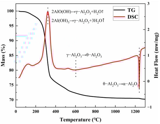 Figure 1 shows the simultaneous thermal analysis (TG-DSC) curve of the product of ρ-Al2O3 hydration for 24 h. Two characteristic endothermic peaks and two exothermic phase transition peaks can be observed in the DSC curve. The endothermic peak observed at 121 °C is attributed to the desorption of physically adsorbed water, while the endothermic effects at 320 °C and 550 °C correspond to the stepwise dehydration of Al(OH)3 (bayerite) and AlO(OH) (boehmite), respectively, leading to the formation of metastable γ-Al2O3. The corresponding TG curve showed continuous weight loss behavior in this temperature range, and the total weight loss rate reached 25%, which was highly consistent with the theoretical dehydration (adsorbed water + structural hydroxyl group removal). The exothermic peak of the DSC curve at 610 °C corresponds to the enthalpy of phase change released by lattice reconstruction during the phase transition of γ-Al2O3 →θ-Al2O3. The strong exothermic peak at 1240 °C is attributed to the irreversible phase transition of θ-Al2O3→α-Al2O3. It is worth noting that the α phase generation peak is fully present before 1300 °C, indicating that the phase transition process can be fully completed at this temperature. Based on this thermodynamic analysis, 1300 °C was selected as the optimal calcination temperature to ensure the high-purity conversion of the α phase.