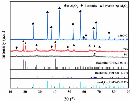 Figure 2 shows the XRD plots of ρ-Al2O3 feedstock, hydrated 24 h products, and products calcined at 1300 °C for 2 h, and the diffraction peaks of ρ-Al2O3 can be observed as amorphous diffuse peaks, which are consistent with the results reported in the literature [31]. After 24 h of ρ-Al2O3 hydration, the diffraction peak of the product conformed to the PDF cards of Boehmite and Bayerite, indicating that the hydration product was composed of Boehmite and Bayerite. The diffraction peak of the hydration product was consistent with the PDF card of α-Al2O3, and there was no diffraction peak of θ-Al2O3, indicating that the pure phase α-Al2O3 could be obtained after calcination at 1300 °C for 2 h.