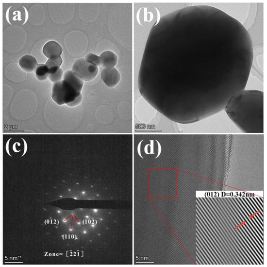 Figure 3 shows the TEM test results of the sample with 0.1% NH4BF4 addition after calcination at 1300 °C for 2 h. From Figure 3a,b, it can be seen that the sample particles exhibit a near-spherical topography with a particle size between 1 μm and 2 μm. The results are shown in Figure 3c, indicating that the sample has a tripartite phase structure, and the results of the crystal plane index identification corresponding to the diffraction spot are consistent with the tripartite phase. Figure 3d shows the high-resolution HRTEM results, the Fourier transform and the reverse Fourier transform are performed on the red frame area to obtain the lattice fringes of the sample, and the lattice fringe spacing measured at the arrow is 0.342 nm, which is consistent with the spacing of the (012) crystal plane, indicating that the substance is α-Al2O3.
