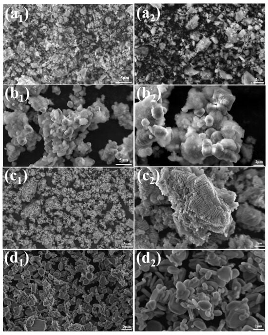 SEM images of (a1,a2) ρ-Al2O3, (b1,b2) hydration 24 h products, (c1,c2) hydration product was calcined at 1300 °C for 2 h without NH4BF4, (d1,d2) hydration product was calcined at 1300 °C for 2 h with 0.4% NH4BF4.