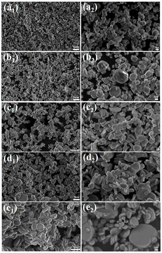 SEM images of calcination products of samples with different dosages calcined at 1300 °C for 2 h (a1,a2) 0.1%, (b1,b2) 0.2%, (c1,c2) 0.3%, (d1,d2) 0.4%, (e1,e2) 0.5%.