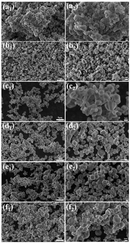 SEM images of calcination products of samples with different dosages calcined at 1300 °C for 2 h (a1,a2) 0.04%, (b1,b2) 0.06%, (c1,c2) 0.08%, (d1,d2) 0.12%, (e1,e2) 0.14%, and (f1,f2) 0.16%.
