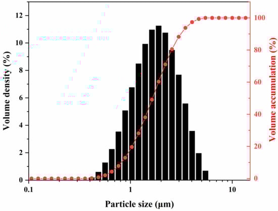 Figure 7 shows the particle size distribution of the calcination product obtained by calcination at 1300 °C for 2 h with 0.1% NH4BF4. Particle size analysis revealed that the D10, D50, and D90 values were 0.81 μm, 1.65 μm, and 3.11 μm, respectively, with a span of 1.39, indicating a moderate dispersion of the particles. Micron-sized particles accounted for 83% of the total. This multi-scale particle size distribution facilitates tighter packing of the fillers within the matrix—wherein larger particles form a primary framework while finer particles fill the interparticle voids—thereby enhancing phonon transport efficiency and contributing to improved thermal conductivity of the composite material. This mechanism is supported by the study of Wang et al. [33], in which an optimized alumina filler system (60 wt% loading, with a particle size ratio of 5.8 μm:2.6 μm:0.5 μm = 7:2:1) exhibited a 23–32% increase in thermal conductivity compared to systems using a single particle size.