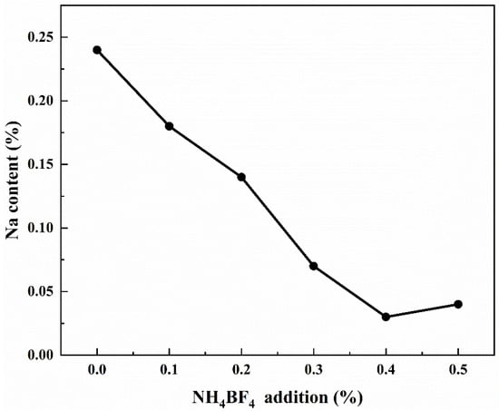 Since the vast majority of bauxite worldwide is processed using the Bayer process—an alkaline method that utilizes a significant amount of sodium hydroxide solution—industrial-grade Al(OH)3, Al2O3, and other aluminum precursors produced via this method typically contain certain amounts of residual Na impurities [34]. Figure 8 shows the test results of Na content of samples calcined at 1300 °C for 2 h with NH4BF4 addition, and it can be observed from Figure 8 that the addition of NH4BF4 can reduce the content of impurity Na in the calcination products, and the impurity Na content in the sample decreases with the increase of NH4BF4 addition, from the initial 0.24% to 0.03%, as the high-temperature decomposition of NH4BF4 will form intermediate products containing element B and F. The intermediate product containing elements B and F reacts with Na2O to form NaBO2 and NaF, which volatilize at high temperatures, thereby reducing the content of the impurity Na [12].