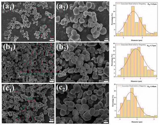 Figure 5 shows the SEM images of the calcination products of samples with different dosages calcined at 1300 °C for 2 h. As can be seen from Figure 5, 0.1% NH4BF4 was added, the α-Al2O3 grains in the sample exhibited a predominantly near-spherical morphology with high sphericity, good dispersion among grains, and no significant agglomeration. As the amount of NH4BF4 increased, the near-spherical α-Al2O3 grains became progressively flattened with a non-uniform size distribution. When the addition amount was further increased to 0.5%, the morphology of the α-Al2O3 grains almost entirely transitioned to a plate-like shape. These results indicate that under the experimental conditions applied in this study, 0.1% NH4BF4 is the optimal addition amount for obtaining near-spherical α-Al2O3. Excessive addition disrupts the coordination balance during crystal growth, leading to a transition in grain morphology from near-spherical to plate-like.
