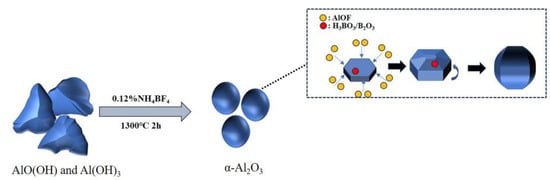 Figure 10 illustrates the schematic diagram of the mechanism of NH4BF4 action. Due to the fact that the (0001) crystal plane and its symmetrical equivalents in α-Al2O3 crystals are closely packed planes with relatively low surface free energy and poor adsorption capacity compared to the other six crystal planes, AlOF is preferentially adsorbed onto the other six planes, leading to plate-like growth [12]. However, when H3BO3 is introduced into the system, it may interact with surface hydroxyl groups on the crystals, reducing the growth activation energy and accelerating three-dimensional grain growth. On the other hand, borate ions generated from the decomposition or hydrolysis of H3BO3 at high temperatures may incorporate into the crystal lattice or adsorb at grain boundaries, altering the local ionic environment and further promoting grain growth [35]. As a result, the addition of H3BO3 may cause plate-like grains to thicken and increase in size, driving a morphological transition toward a spherical-like shape.
