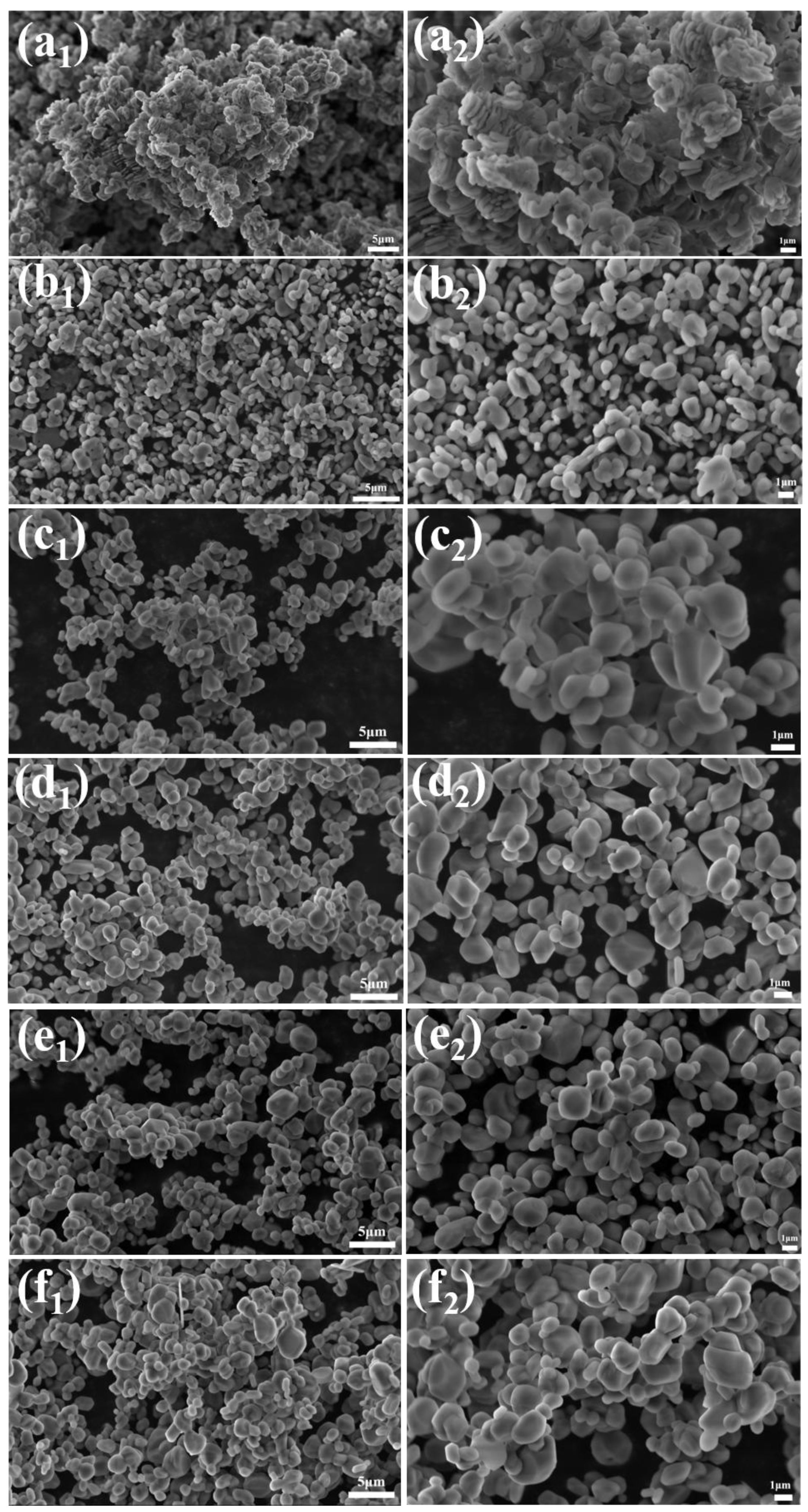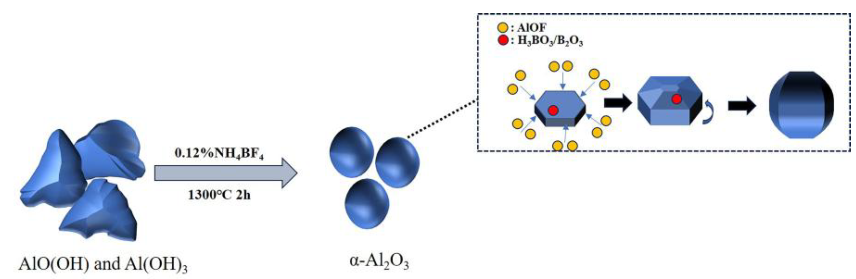 - The addition of NH4BF4 effectively modulates the crystal morphology of α-Al2O3, with a pronounced correlation to the amount added. The underlying mechanism involves the thermal decomposition of NH4BF4 into fluorine-containing (e.g., HF and AlF3) and boron-containing (e.g., H3BO3) intermediates. Fluorine and boron act synergistically to alter the surface energy distribution at the crystal growth interface, thereby suppressing anisotropic growth and promoting equiaxial development, leading to the formation of a near-spherical morphology. Experimental results show that with 0.1% NH4BF4 addition, near-spherical α-Al2O3 powder with D50 = 1.65 μm was obtained. Increasing the addition to 0.5% resulted in a loss of morphological control due to an imbalance in the fluorine-to-boron ratio, yielding a mixture of near-spherical and plate-like α-Al2O3. In contrast, reducing the addition to 0.04% provided insufficient mineralizer concentration, resulting in entirely agglomerated vermicular α-Al2O3 without effective morphology regulation.