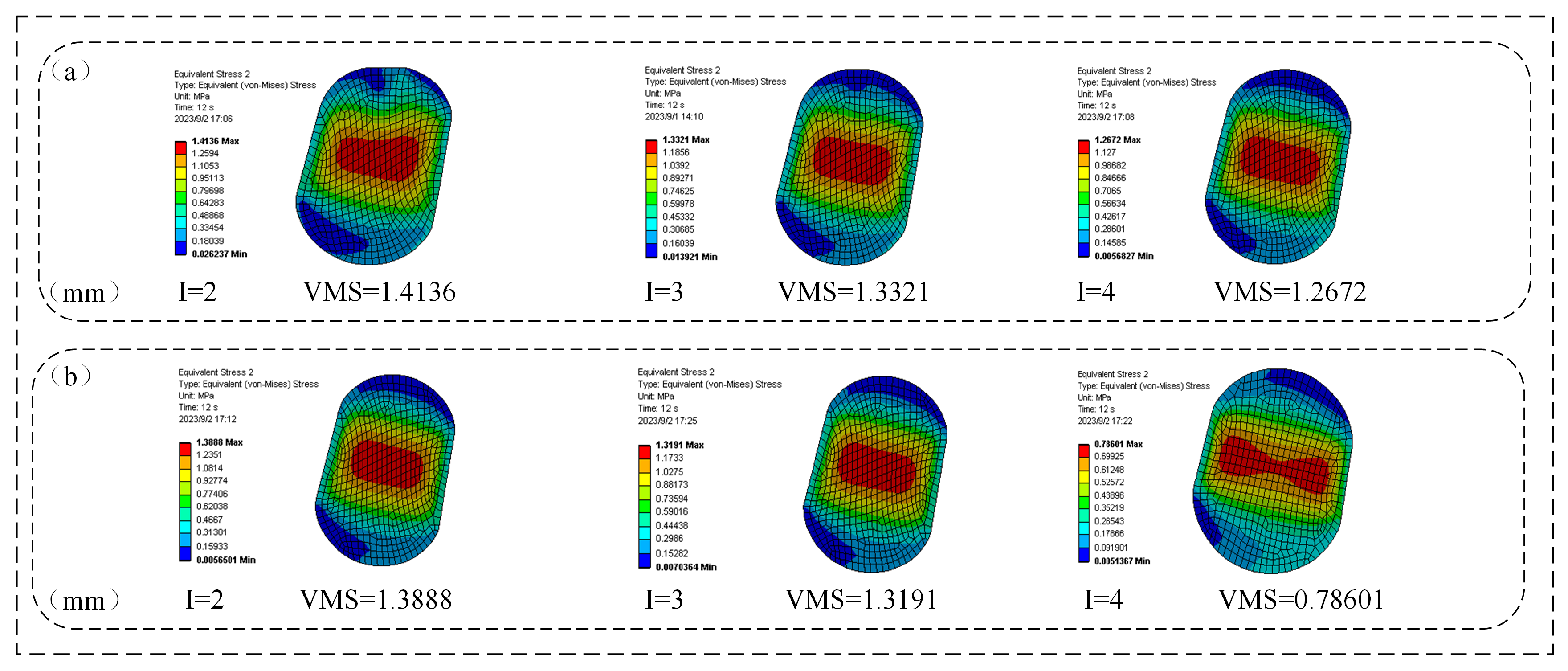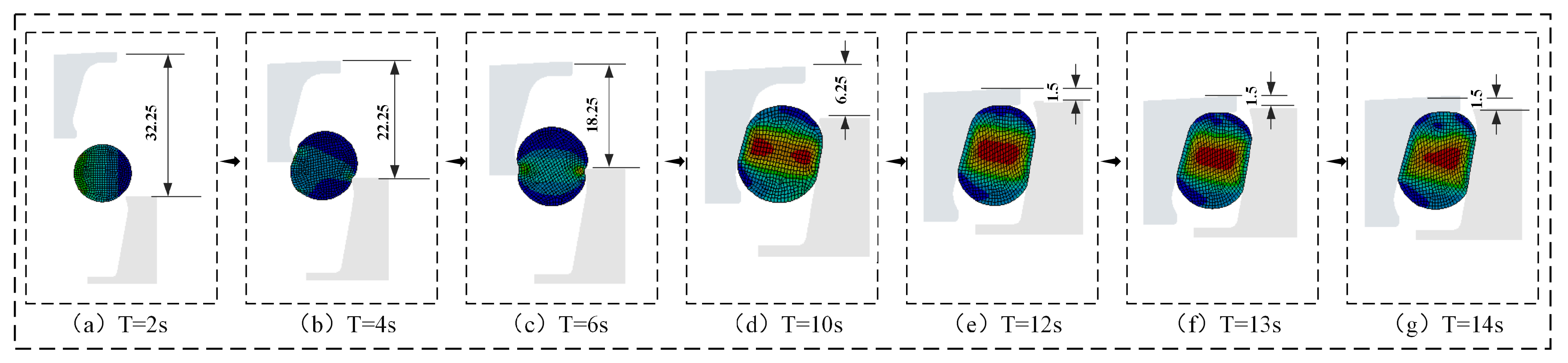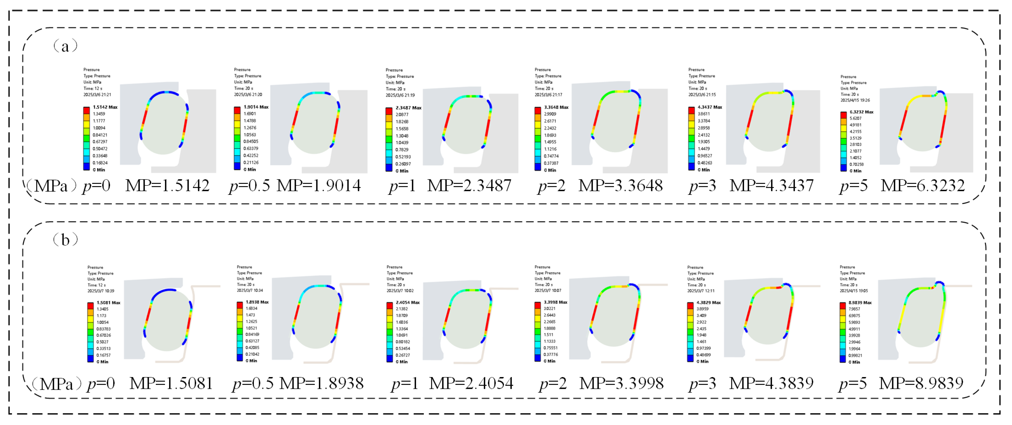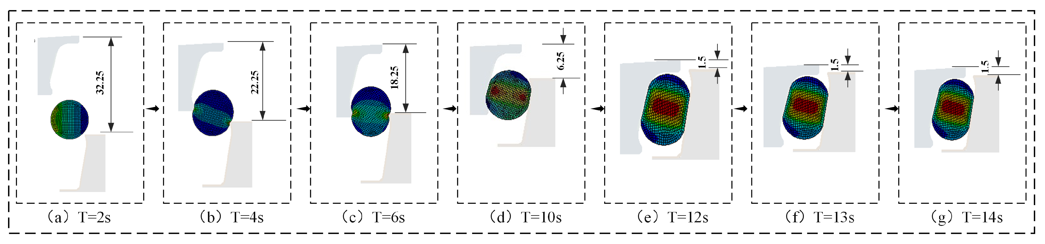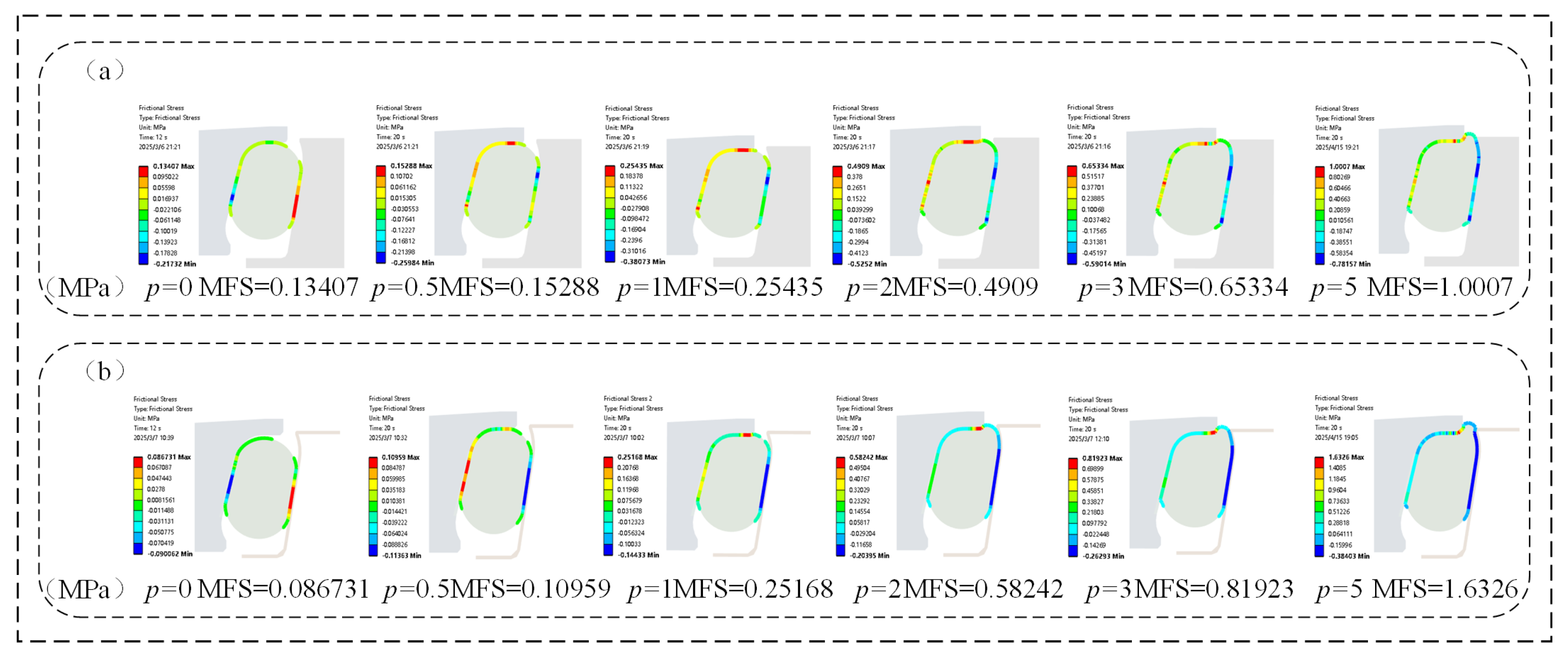- 10 s ≤ T < 12 s: During final positioning between the floating seal ring’s outer cone and seal seat cavity, both seal types showed rapid von Mises stress escalation.