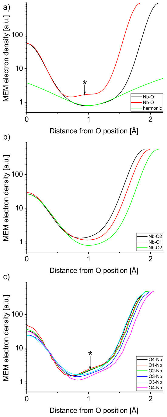 MEM electron density profiles of Nb-O bonds in (a) LN and exemplary harmonic curve, (b) KN, and (c) NN. Features marked with an asterisk are discussed in the text.