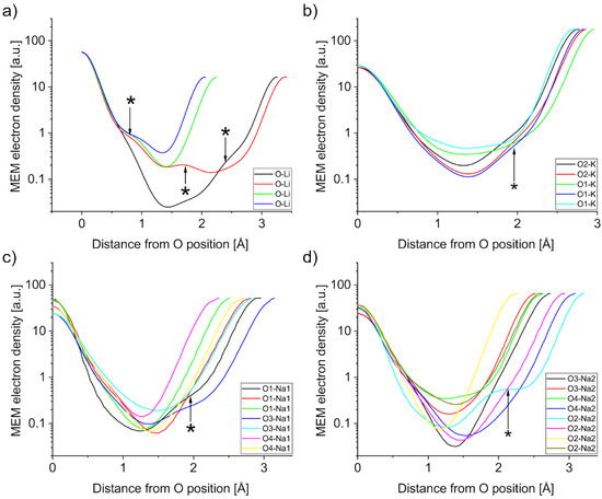 MEM electron density profiles of A-O bonds in (a) LN, (b) KN, (c) and (d) NN. Features marked with an asterisk are discussed in the text.
