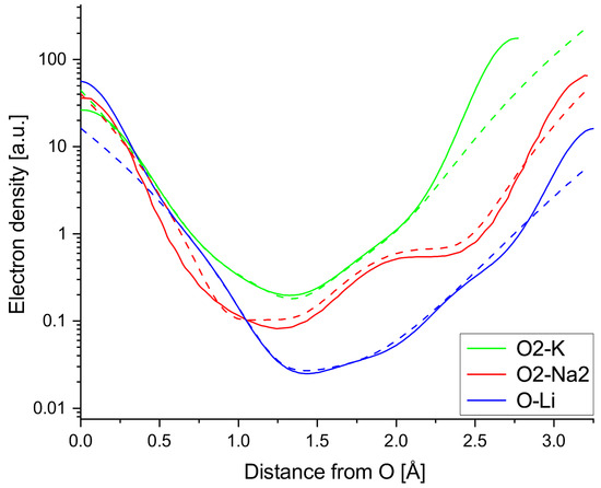 Taylor expansions are performed around the A-side shoulders of the A-O bonds to find the leading terms of the Taylor expansions, gauge the strength of the anharmonicity in the measured niobates and compare the A-O interaction found in this work to the fourth order anharmonic potential term Zhang et al. used to obtain AFE CaTiO3. The Taylor expansions (dashed lines) plotted in Figure 7 are terminated after the 6th order term, which is required to get a decent fit for the entire bond, but locally the expansions yield good agreement terminating the expansions after the fourth order term, showing the anharmonic character of the observed A-O interaction (All numbers rounded to second decimal. The value at the peak of the Na2-O2 shoulder is off by about 0.1 e/Å3 due to the initial polynomial fit, which is used to obtain a continuous function and thus circumvent the issue of uneven voxel spacing along the bond line). Dividing the Taylor coefficients by the respective factorials shows that the fourth order term is the leading term in all three Taylor expansions in Equations (5), (A1) and (A2). Equations (A1) and (A2) can be found in the Appendix A. As expected, the fourth order term is most dominant over the lower order terms in the Na2-O2 bond.