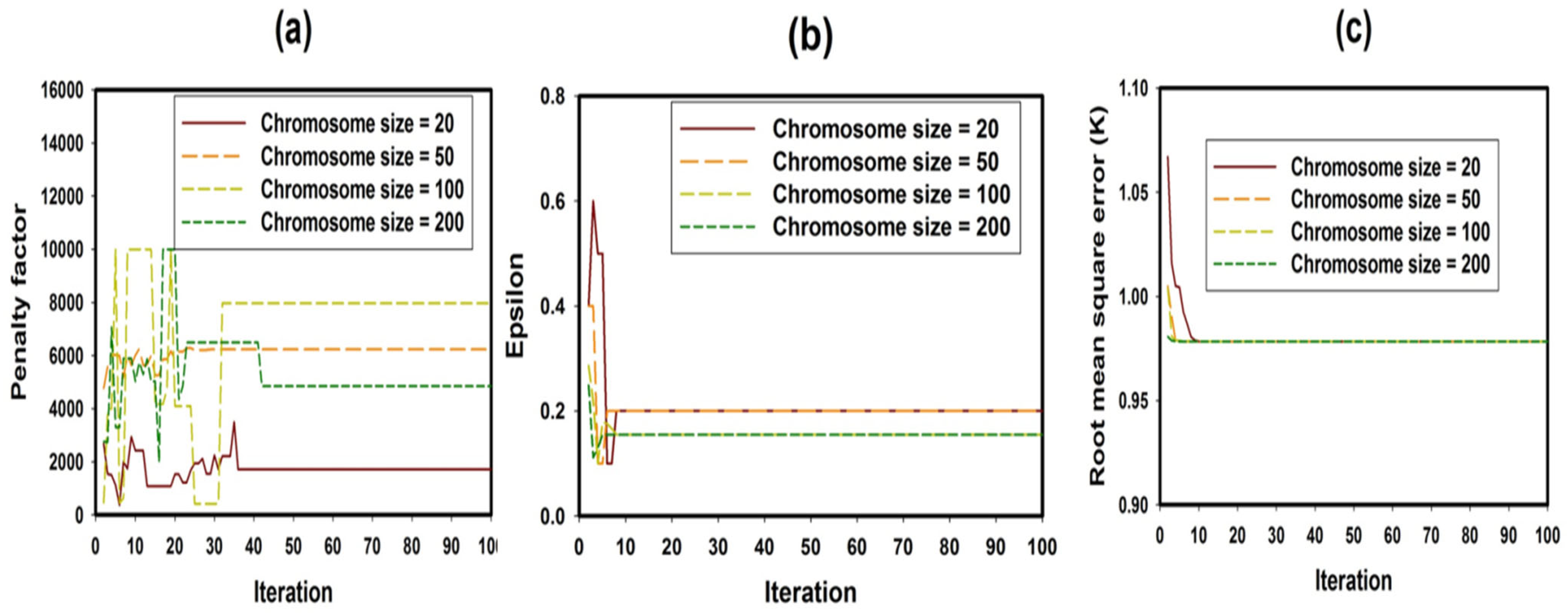 For the penalty factor convergence presented in Figure 4a, stable convergence was attained after fortieth iteration for all the investigated chromosome sizes. Penalty factor, also known as regularization factor, penalizes data points outside the precision zone. The parameter controls and balances the tradeoff between model complexity and precision. Epsilon convergence shown in Figure 4b describes the user-defined error zone during pattern acquisition. For every investigated chromosome size, stable convergence was attained after tenth iteration. The fitness function, which measures the strength of each individual chromosome, is shown in Figure 4c at different sizes of chromosomes. The convergence of fitness function (determined through root mean square error computation) does not significantly depend on the size of the chromosome and iteration number (since stable convergence appears just before tenth iteration for all the investigated chromosome sizes). Table 2 contains the optimum (global) values for each of the precision tuning parameters in support vector regression algorithm.