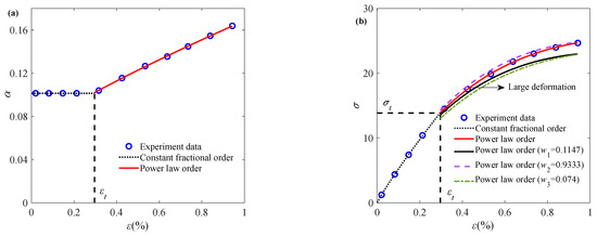 It can be seen from Equation (10) that the stress and strain relationship presents a linear relationship under the double logarithm coordinates, with a slope of 1−α. Therefore, the experimental data in Figure 1 are processed logarithmically. As for ln(ε) < ln(εt), the relationship between ln(ε) and ln(σ) is approximately linear. The constant fractional order α = 0.1014 in the initial stage can be obtained by calculating the slope according to Equation (10). At this time, the constant fractional order α can better describe the experimental data.