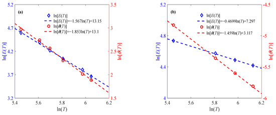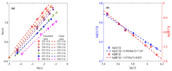 The stress–strain relationship of sintered nano-silver paste from 233.15 K to 458.15 K at a constant strain rate of 0.01% s−1 is selected for discussion [5]. Similarly to the processing method in the previous subsection, the experimental data under the double logarithmic coordinate system are processed to obtain the constant fractional order α at different temperatures in the initial stage, as shown in Figure 2a. The determined constant fractional order α is further substituted into the fractional order constitutive model to achieve the corresponding parameters E and θ at different temperatures. As shown in Figure 2b, the elastic modulus E and relaxation time θ decrease with increasing temperature, which is consistent with the classical theory and can be described by Equations (8) and (9).