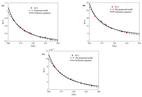 In order to illustrate the rationality of Equations (8) and (9), another two groups of temperature-related sintered nano-silver paste data are selected for verification, as shown in Figure 3. It can be seen from Figure 3 that the established expressions of parameters and temperature can be used to represent the effect of the temperature variation trend on the elastic modulus and relaxation time. Moreover, it can also be found from Figure 2b and Figure 3 that parameters Er, λ1, θr, and λ2 change regularly with the strain rate. As shown in Figure 4, the proposed model is compared against the well-known Arrhenius equation. The resulting R2 values in Table 2 demonstrate that the proposed model achieves comparable accuracy.