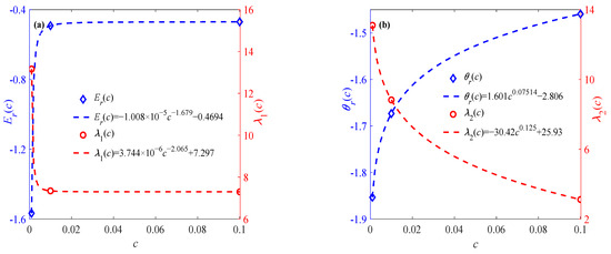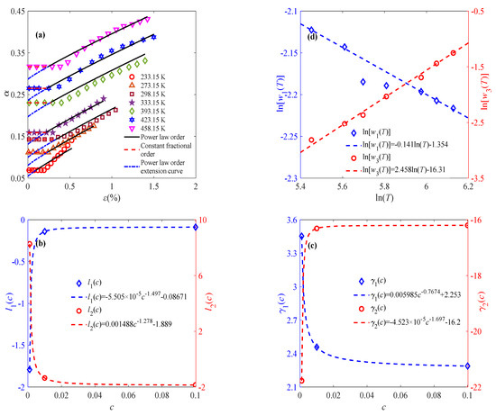 The parameters w1(T, c) and w1(T, c) present as linear functions of the temperature, as shown in Figure 6b, which can be defined as