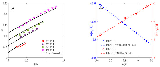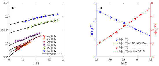 Figure 6a shows the trend of variation in the fractional order of the sintered nano-silver paste under a strain of 0.01% s−1 and seven different temperatures. It can be found from Figure 6a that the fractional orders are power law-related to the large deformation strain, satisfying Equation (7). Hence, the parameters w1, w2, and w3 can be subsequently obtained. According to the experimental data, w2 at different temperatures is almost the same, approximated as 0.9, and is defined as