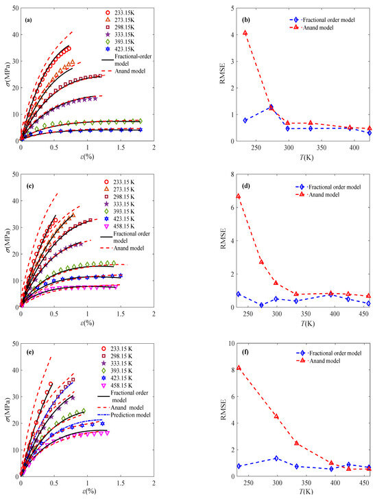 In addition, the mechanical responses at 298.15 K and 423.15 K under a constant strain rate of 0.1% s−1 are selected in this subsection to evaluate the predictive ability of the model. The specified temperature and strain rate are substituted into the model parameter expressions to predict the material’s behavior under given conditions. The predicted results are shown in Figure 9e. It can be found from Figure 9 that the predicted results are very close to the experimental data, indicating that the fractional-order constitutive model can well predict the material’s constant-strain-rate deformation behavior considering the coupling effects of temperature and strain rate.