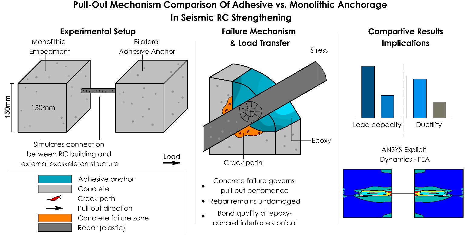 The present paper proposes an experimental and numerical investigation of the pull-out behavior of Ø14 mm reinforcing bars, anchored either by adhesive bonding or monolithically at both ends, in cubic concrete specimens of various strength classes. Our study reproduces a technically relevant situation in seismic strengthening, where a bar provides the connection between the existing and newly added structures. By testing six distinct configurations, the influence of concrete strength class and anchoring type on pull-out resistance and failure mode is assessed. The overall objective is to highlight the use of adhesive anchors as a reliable solution for seismic strengthening through a structural exoskeleton, as well as to propose an alternative testing methodology applicable to the evaluation of structural connections, as a complement to current international standard provisions [