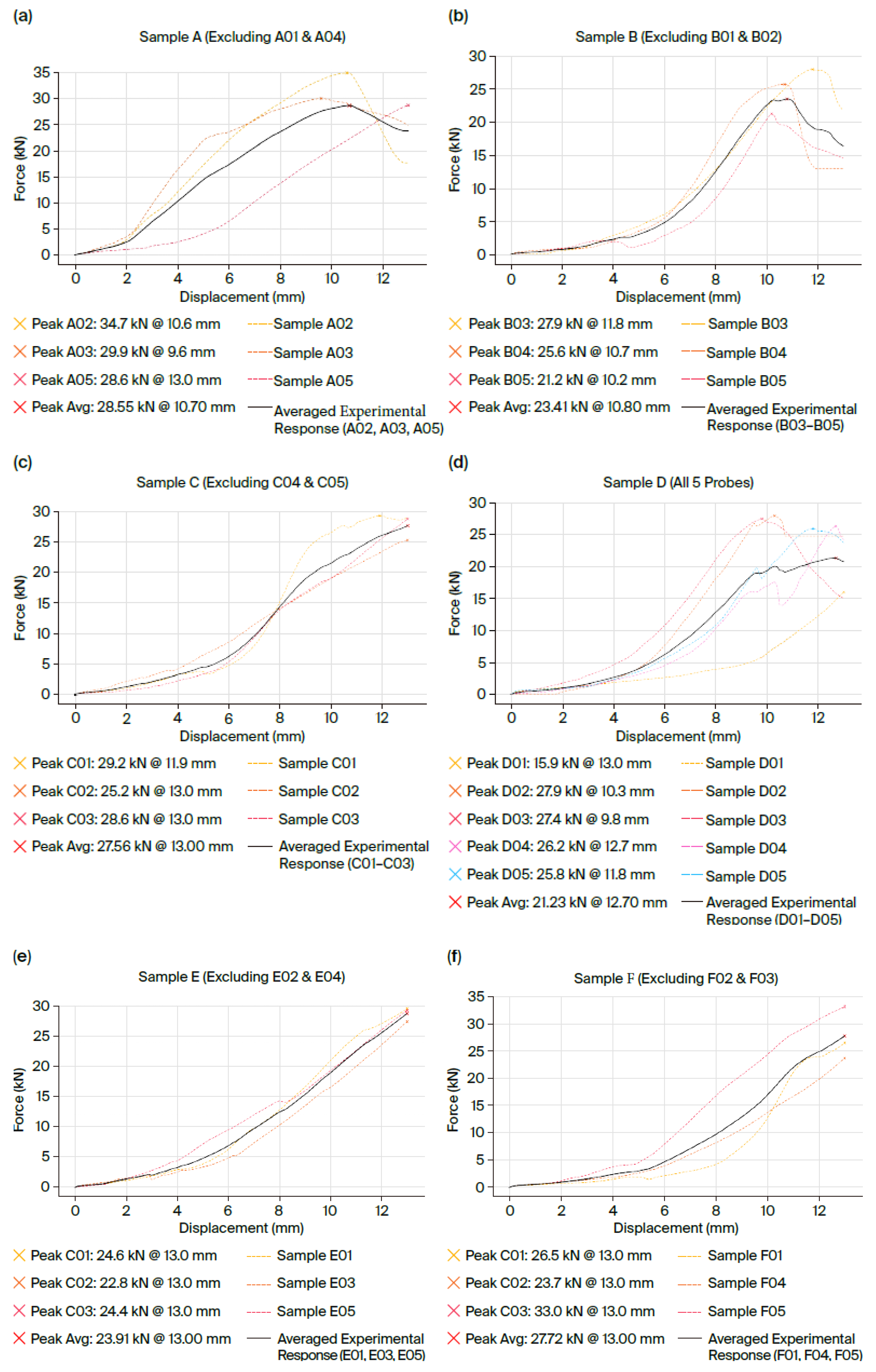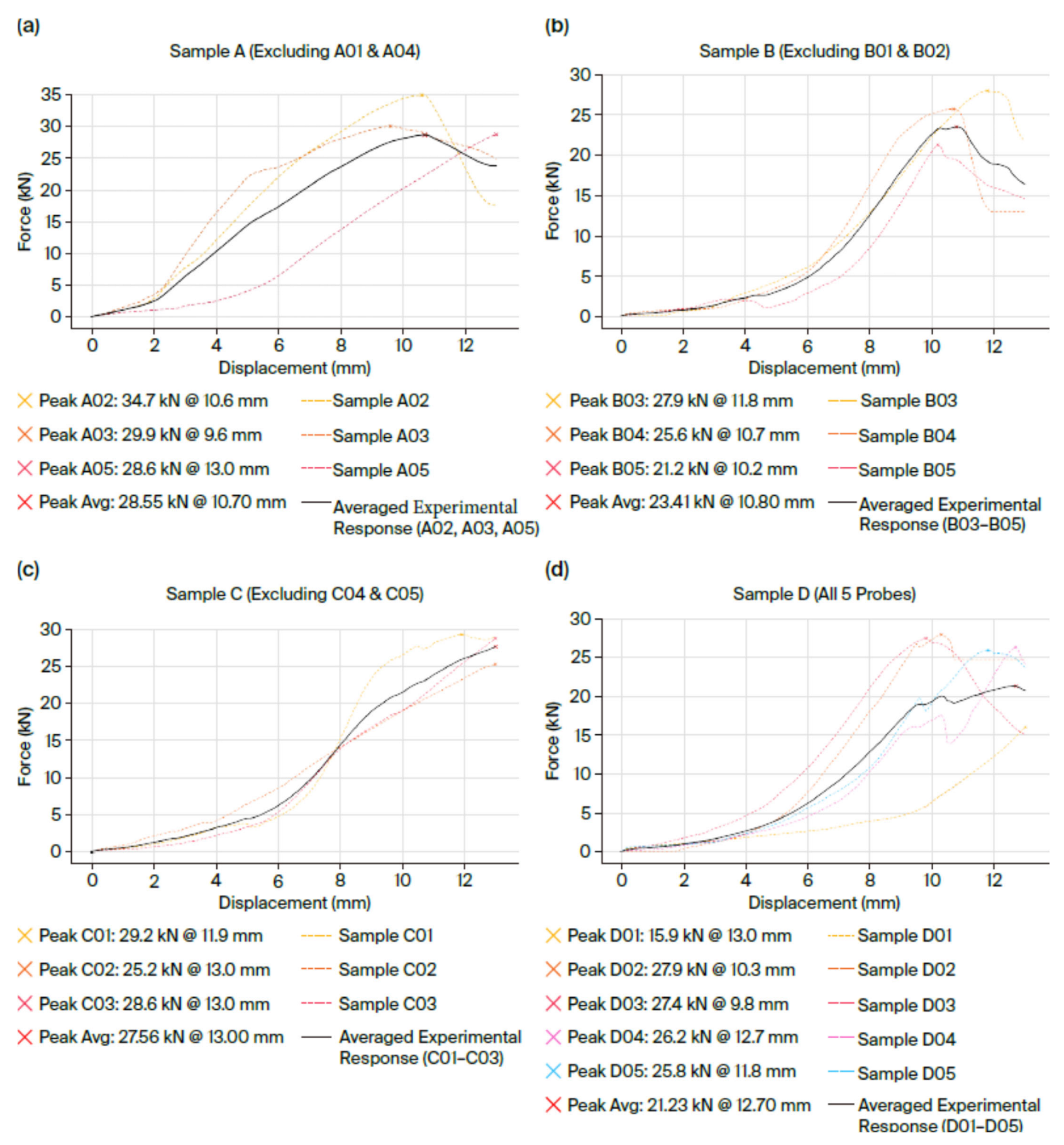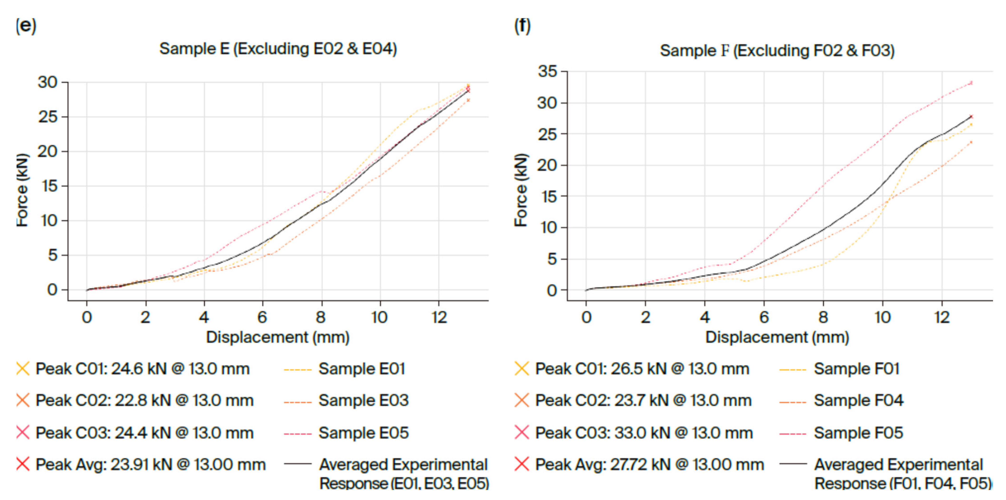 Figure 3 illustrate the force–displacement curves obtained during the tests for each specimen after excluding extreme values, as well as the median curve derived as the arithmetic mean of the force values over the common displacement domain for each test. For each configuration (A-F), five samples were tested. Of these, the curves from the samples that displayed atypical behavior, namely premature failure, were eliminated. As such, these are not presented in the graphs in